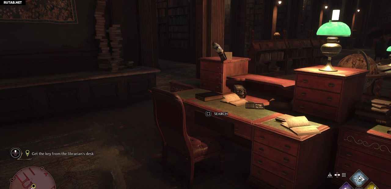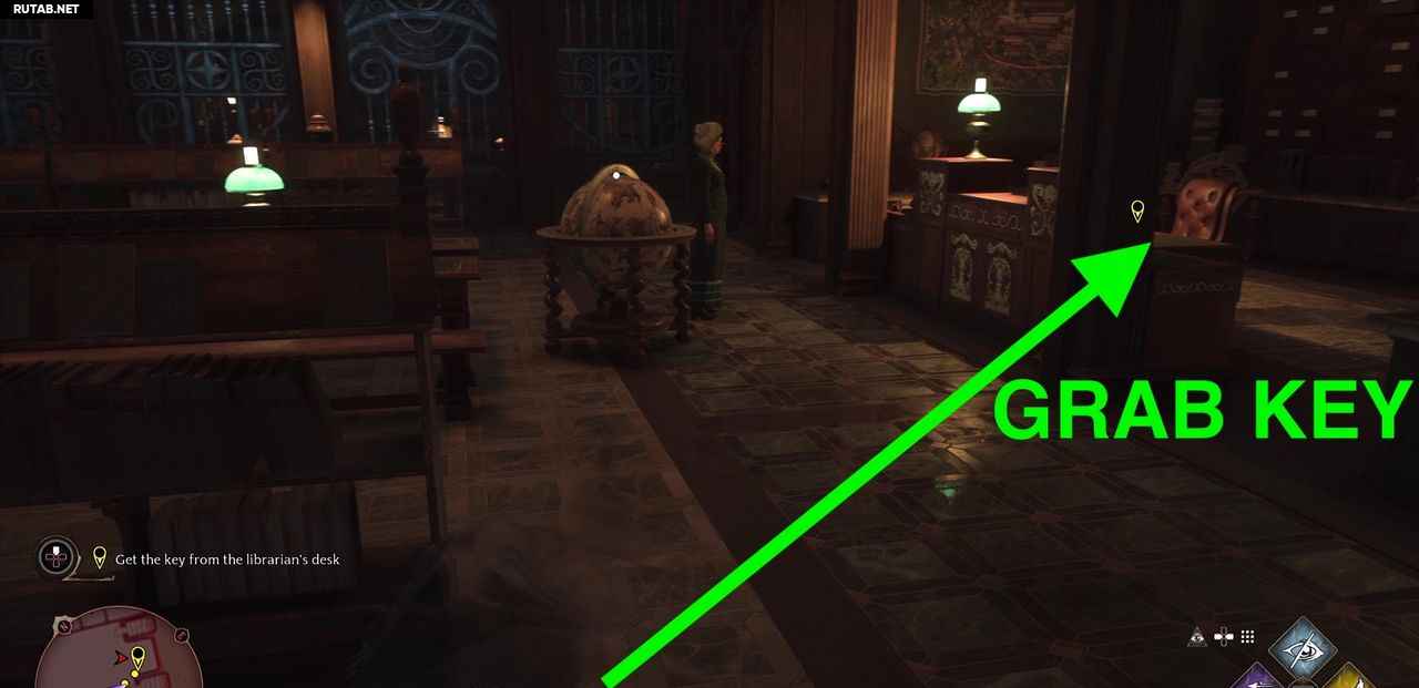Теперь подождите, пока Себастьян опрокинет стопку книг. Это отвлечет библиотекаря, позволяя вам пройти незамеченным к столу и взять ключ из ящика.