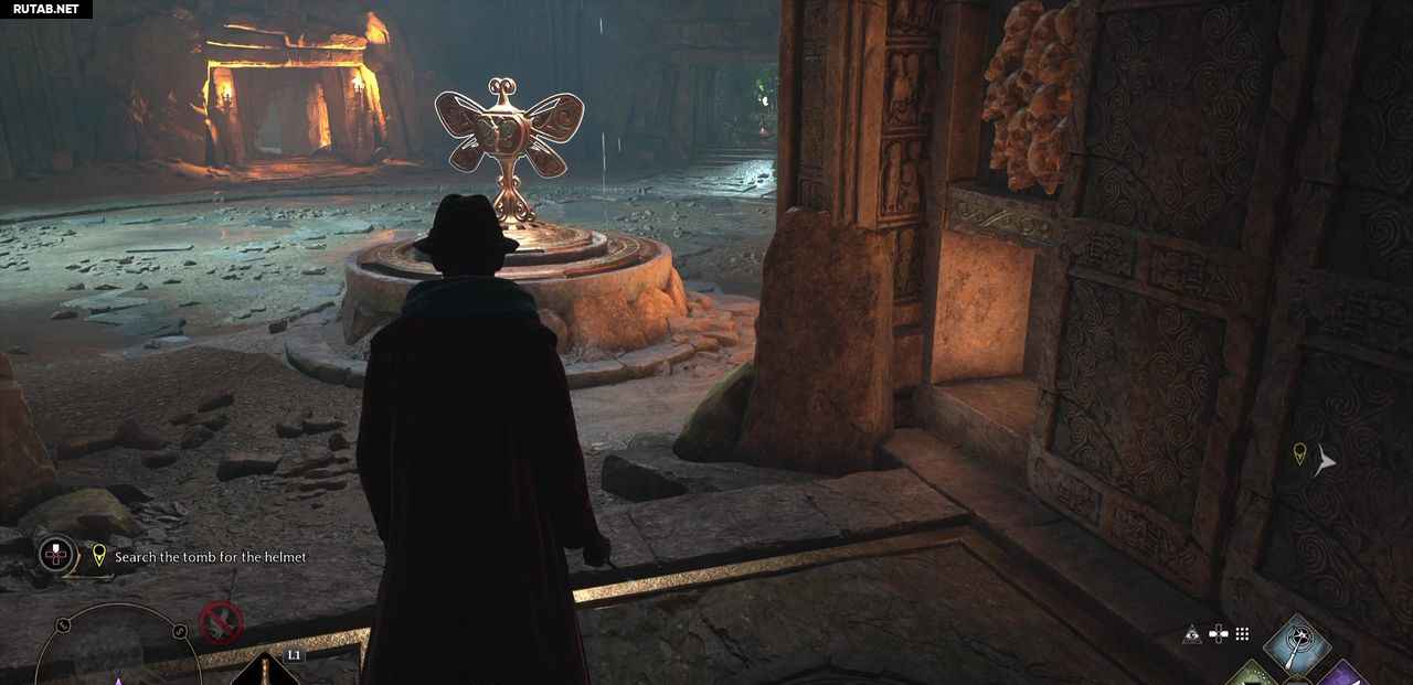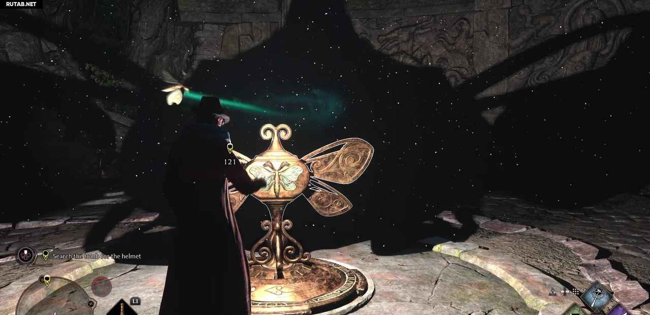 Продолжайте идти по главной дорожке, и вы попадете в круглую комнату с гробницей и еще одной дверью из мотылек. Две мотыльки находятся по обеим сторонам комнаты, поэтому повторите тот же процесс с Люмосом, чтобы заманить их к себе, а затем подойдите к двери, чтобы освободить их. Третий мотылек находится за баррикадой, которую вы можете разрушить с помощью Депульсо.