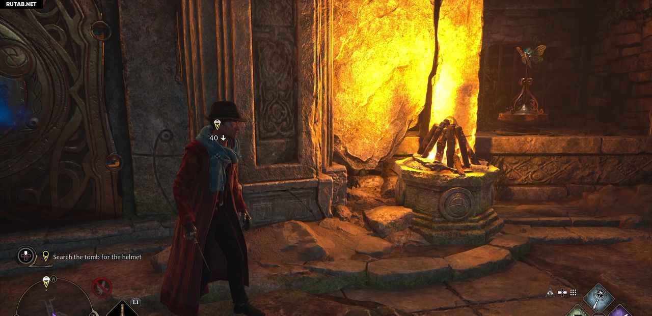 Вернитесь к двери и выключите Люмос, чтобы мотылек заполнил недостающий слот. Пройдите в следующую комнату и откройте каменный сундук слева.
