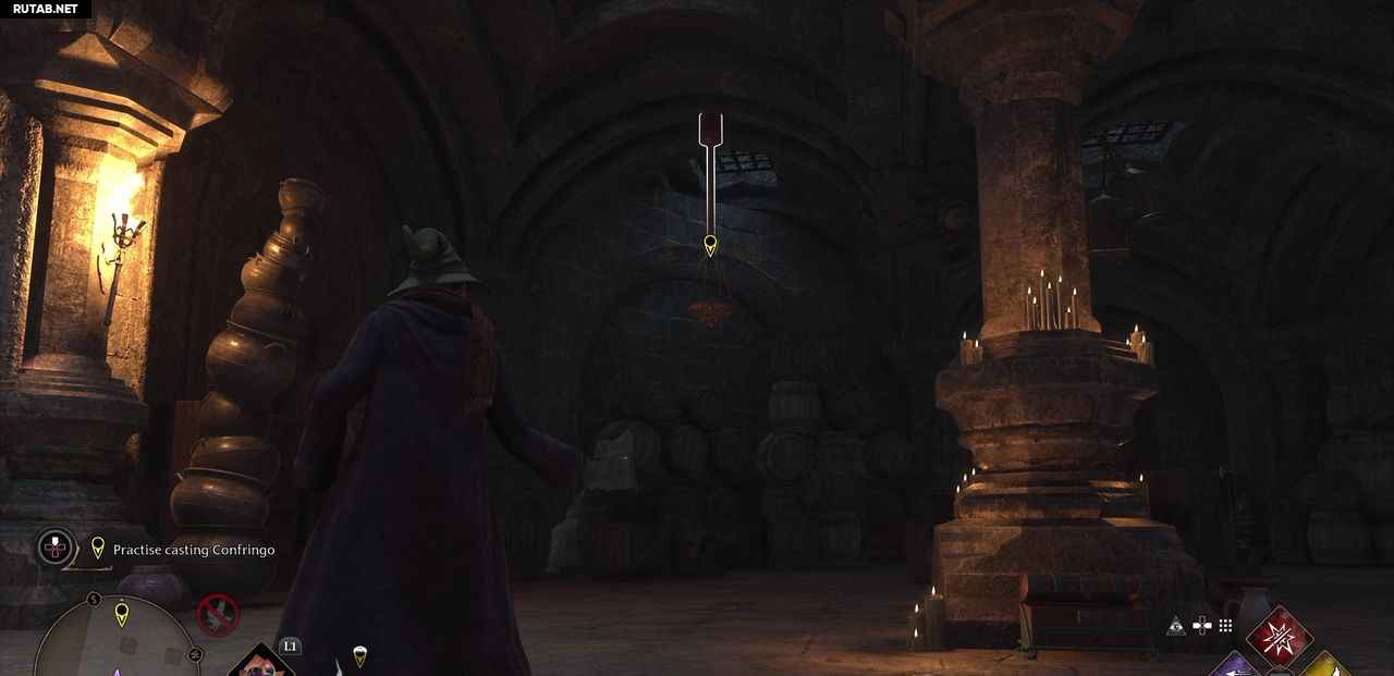 Взрывающее заклятие Конфринго производит взрывной взрыв. Это особенно полезно, если вы хотите поджечь врагов издалека и решить определенные головоломки с окружающей средой по всему миру, в частности, испытания Мерлина. Практикуйте это на потолочных канделябрах, отмеченных желтой путевой точкой. Сначала экипируйте Конфринго в свой набор заклинаний, а затем нажмите