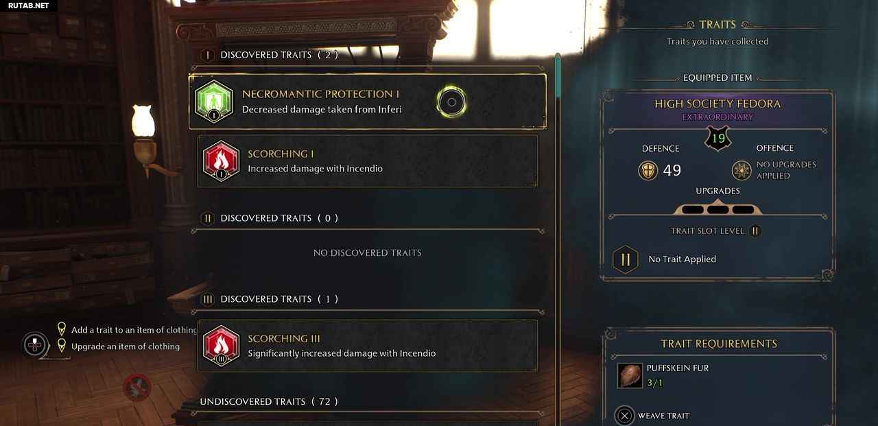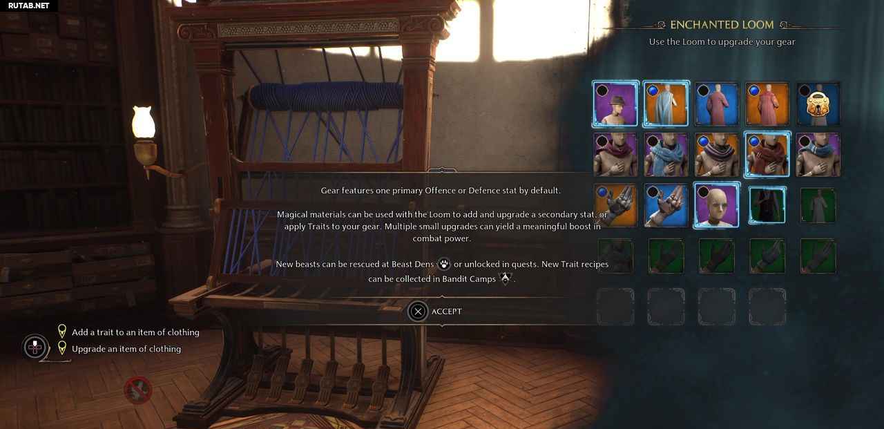 , чтобы открыть инвентарь зачарованного ткацкого станка. Черты позволяют снаряжению добавлять или улучшать вторичную характеристику. Несколько небольших улучшений могут дать значительный прирост боевой мощи. Новых зверей можно спасти в Логове Зверей или разблокировать в квестах. Новые рецепты характеристик могут быть собраны в Бандитских Лагерях. В инвентаре части снаряжения с лазурной окантовкой — это те, которые вы сейчас экипировали. Наведите указатель мыши на любую часть снаряжения, которую хотите улучшить, и нажмите :треугольник:, чтобы просмотреть характеристики. Отсюда выберите любую характеристику, а затем удерживайте