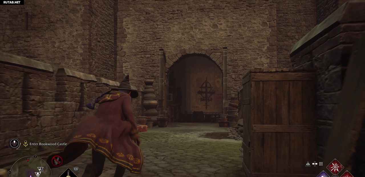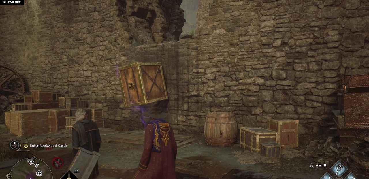 Перейдите к маркеру следующего квеста в задней части замка, и вы попадете в засаду гоблинов-лоялистов. Затем используйте Вингардиум Левиоса на ближайшем ящике, чтобы поместить его рядом с поцарапанной стеной, и заберитесь внутрь.