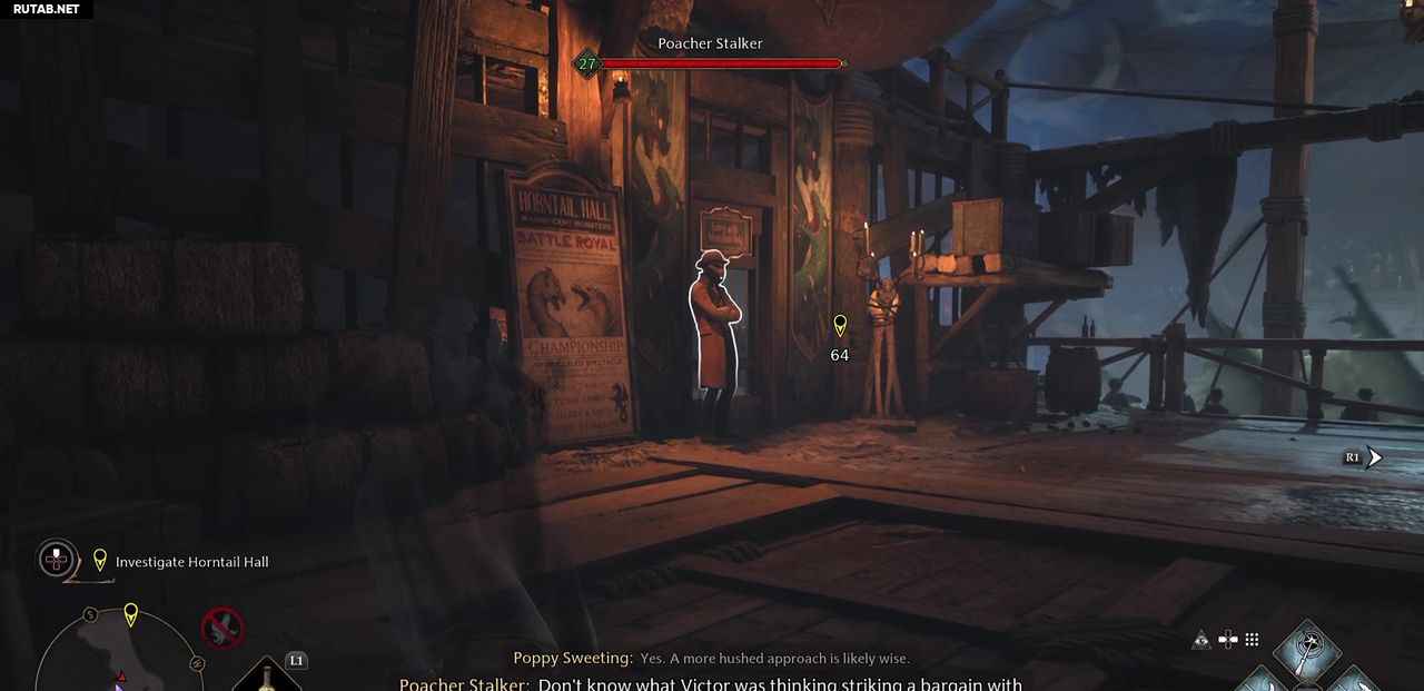 Продолжайте спускаться по лестнице, а затем победите браконьеров и гоблинов на арене.