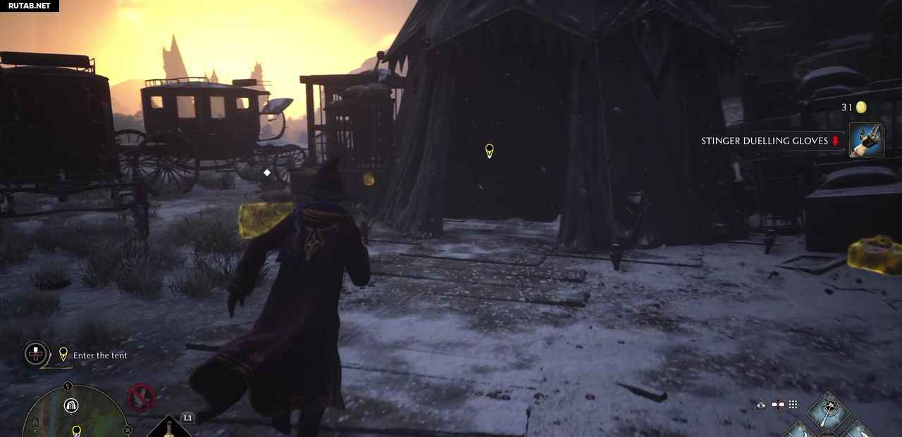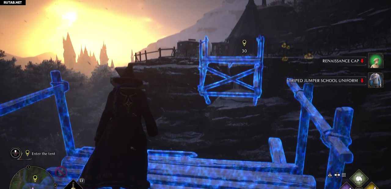 Продолжайте спускаться к вражеской области и выберите свой подход: скрытность или рукопашный бой. Не забудьте использовать Дезиллюминационное заклинание и Петрификус Тоталус, если вы выберете первое, и свой широкий набор заклинаний урона, если вы выберете второе. Как только область будет очищена, обыщите ее, а затем используйте Репаро на мосту, чтобы пройти к палатке.