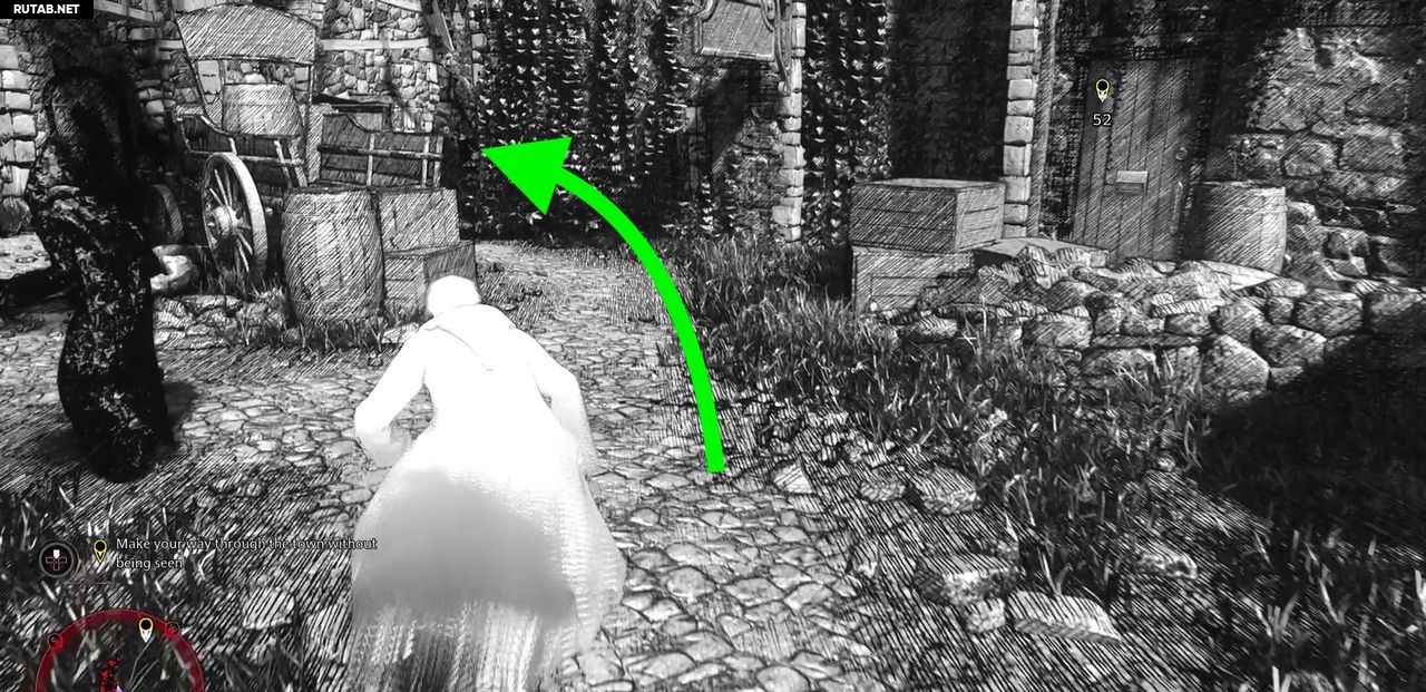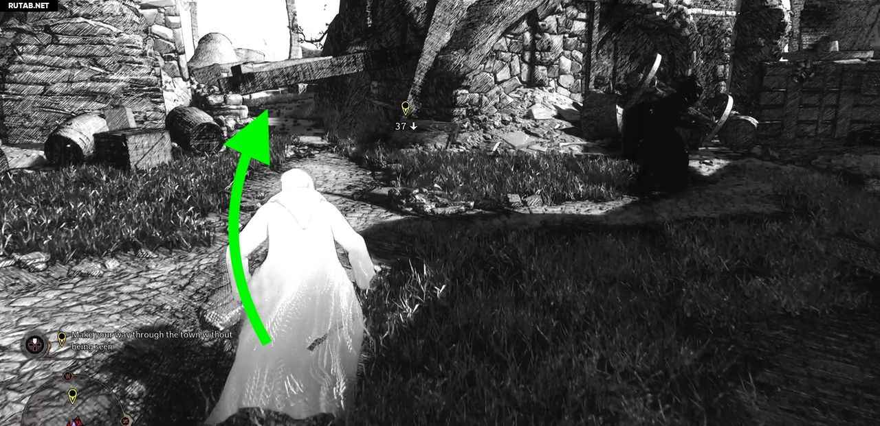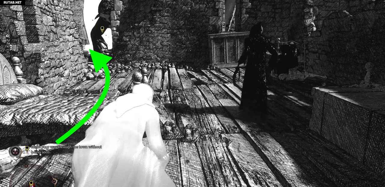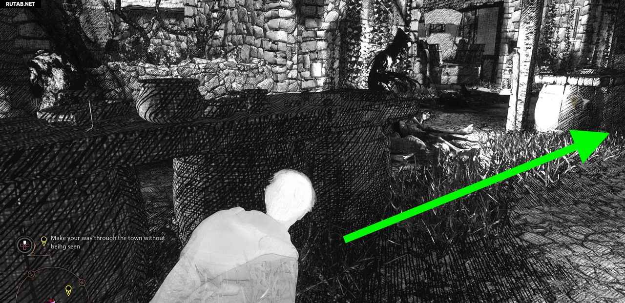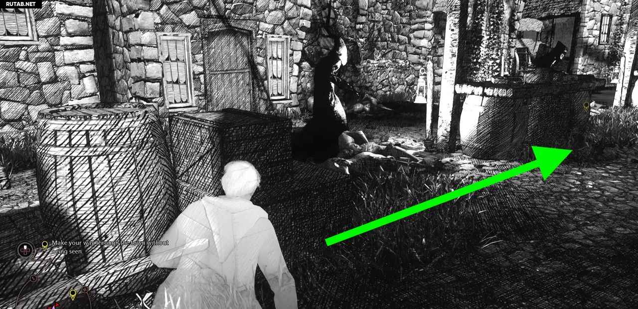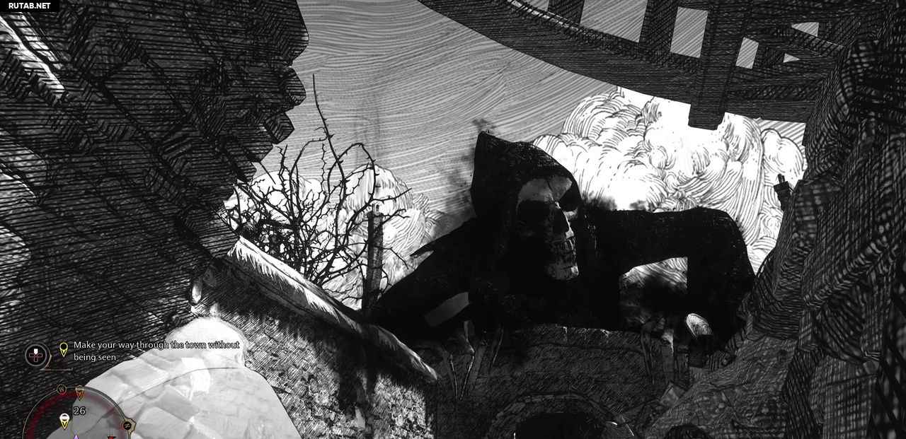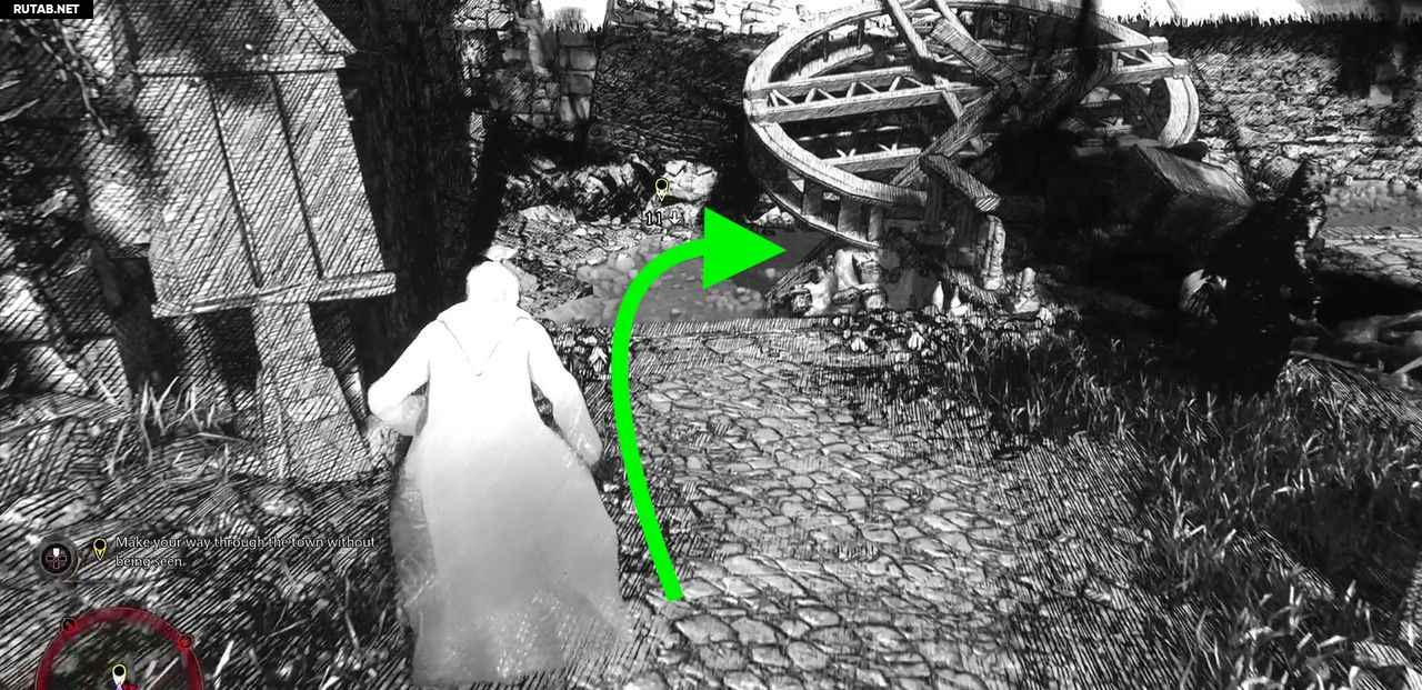В следующей области с черным дымом спрячьтесь за бочками и подождите, пока фигура смерти сдвинется, прежде чем продолжать спускаться по лестнице и под мельничным колесом. Подождите под колесом, пока Смерть уйдет, а затем продолжайте движение к следующему маркеру квеста.