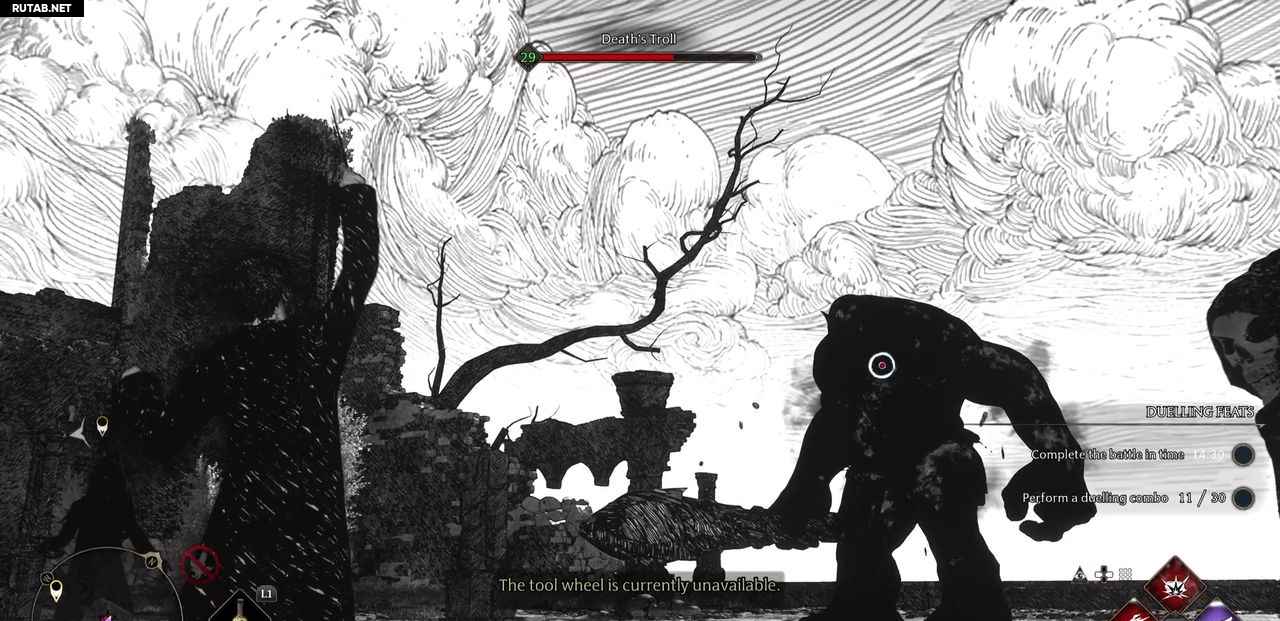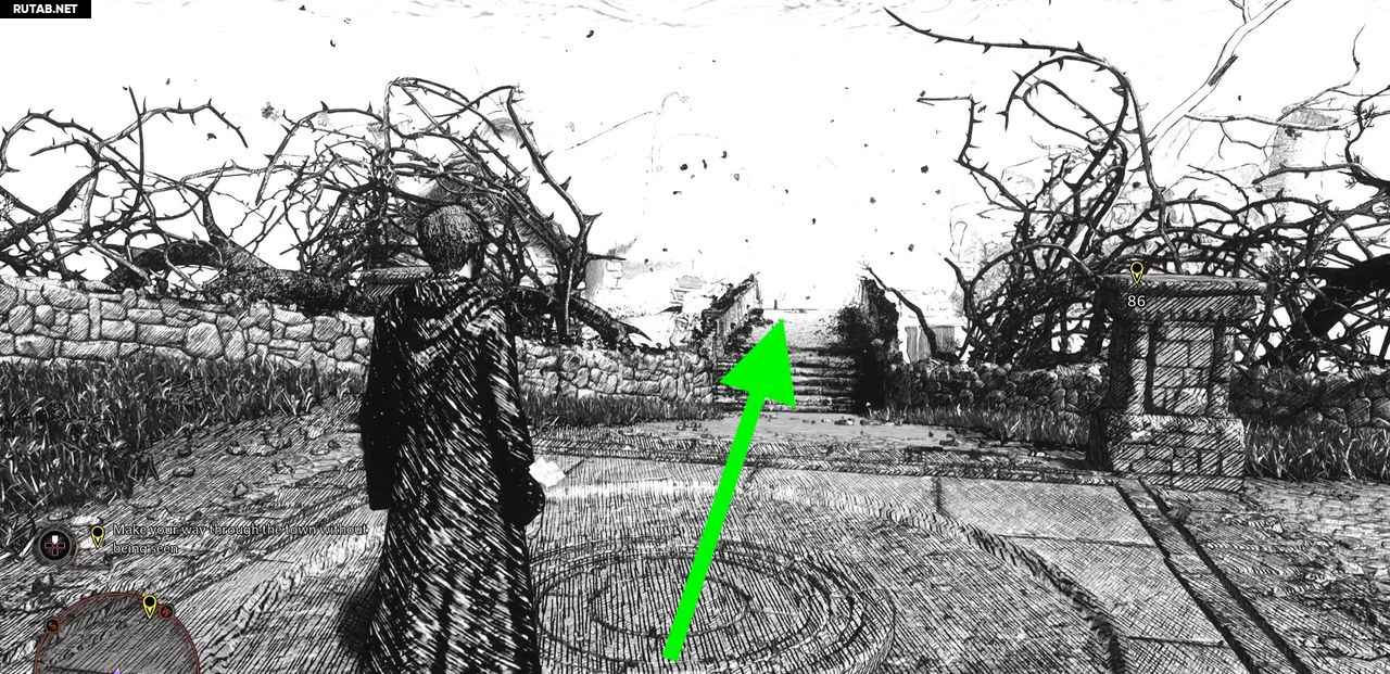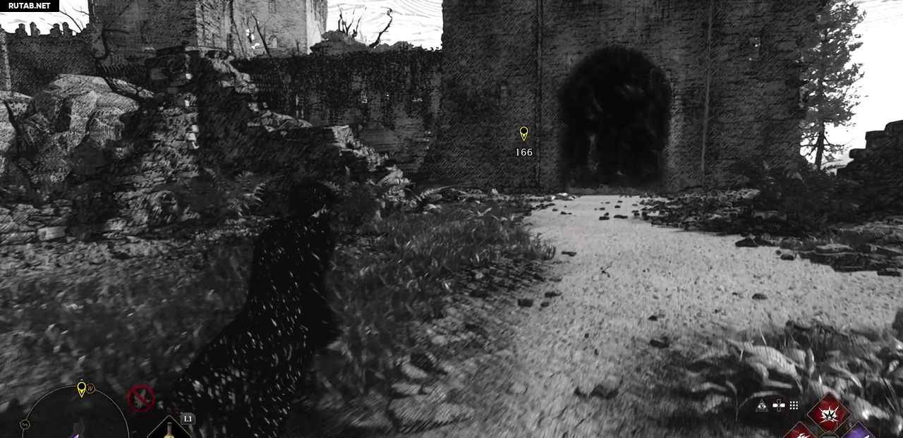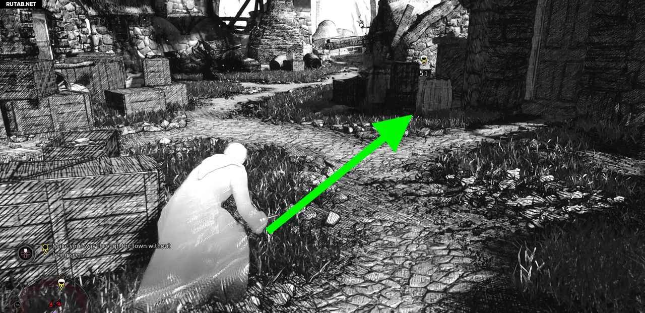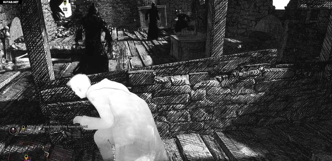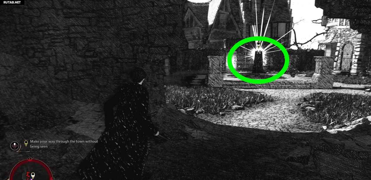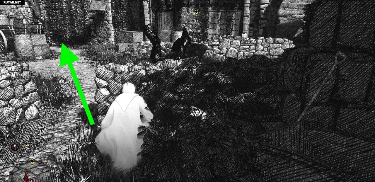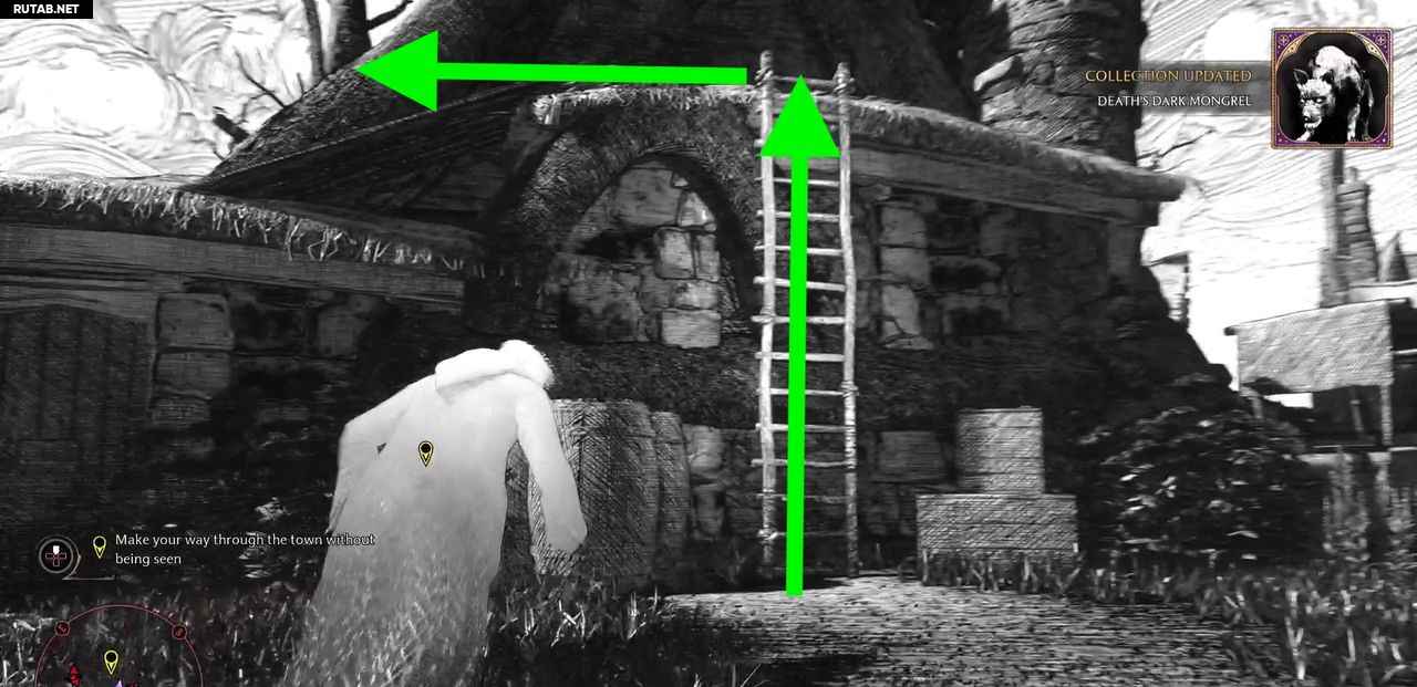 В следующей области с черным дымом спрячьтесь за бочками и подождите, пока фигура смерти сдвинется, прежде чем продолжать спускаться по лестнице и под мельничным колесом. Подождите под колесом, пока Смерть уйдет, а затем продолжайте движение к следующему маркеру квеста.