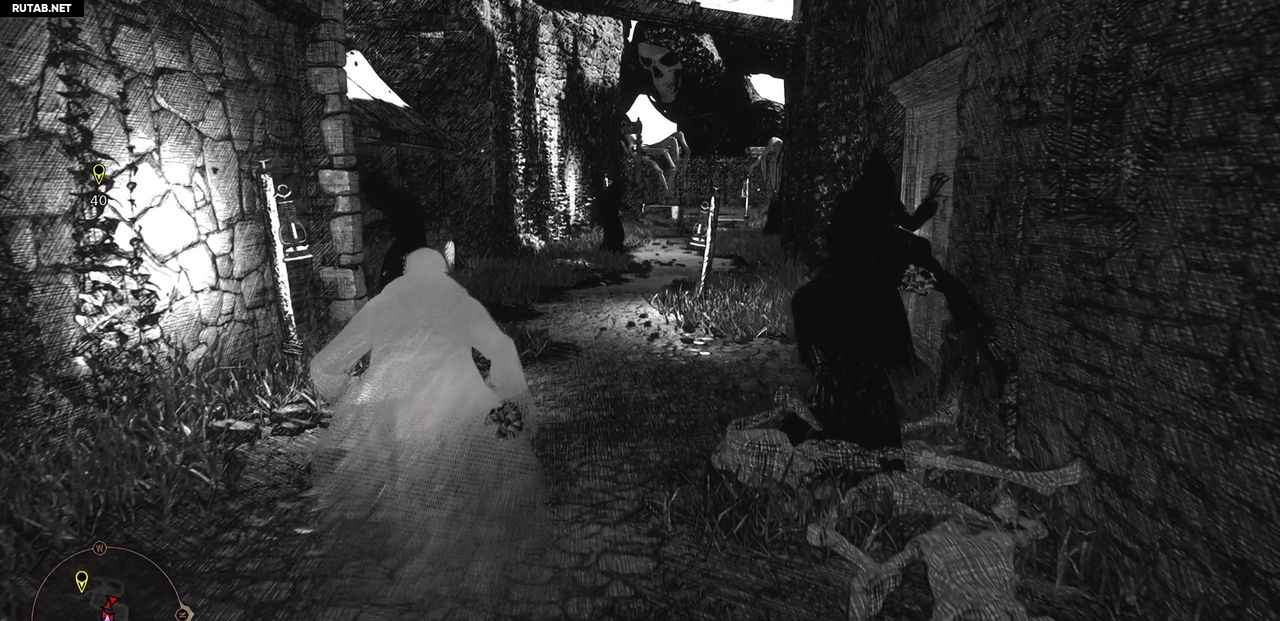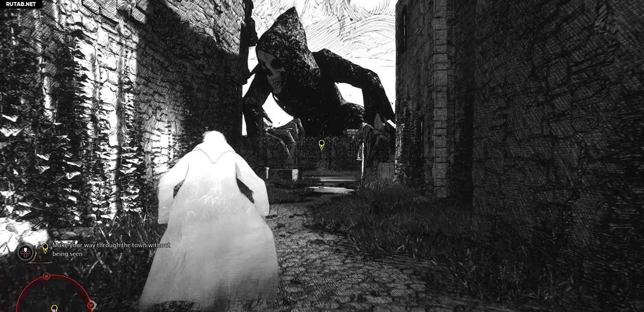 В следующем разделе две фигуры смерти, каждая по бокам киоска посередине. Подождите, пока первый развернется, а затем спрячьтесь за киоском, затем повторите то же самое со второй фигурой смерти, таким образом продолжайте движение к следующему маркеру квеста, чтобы снова увидеть Смерть.