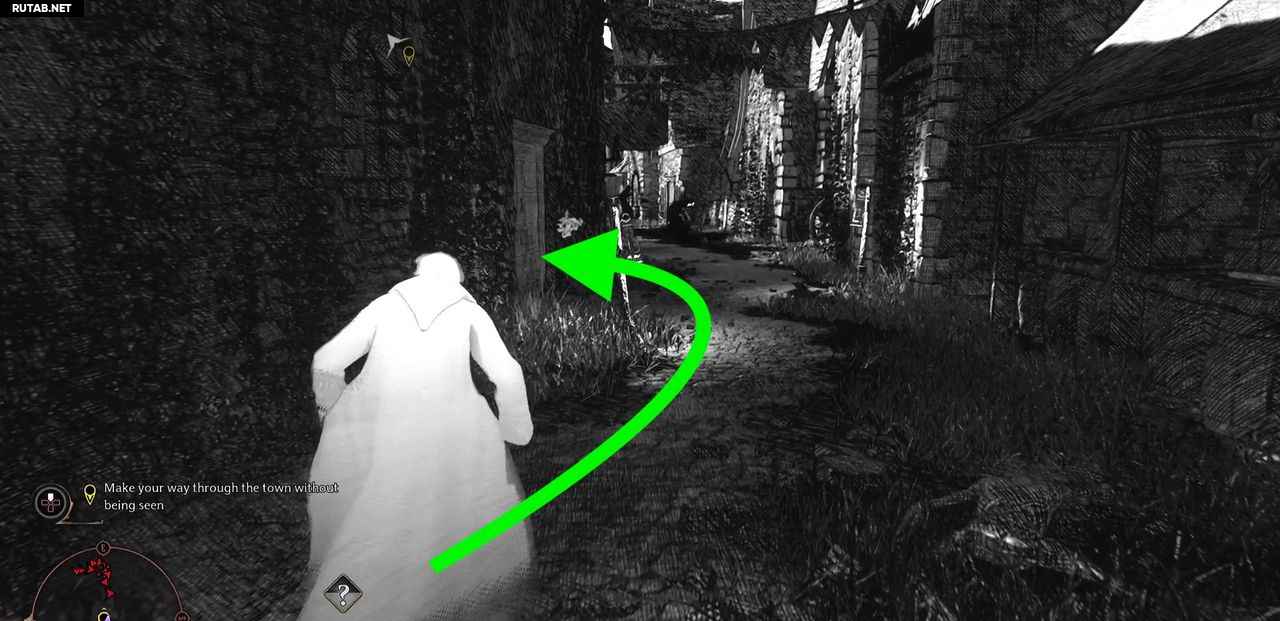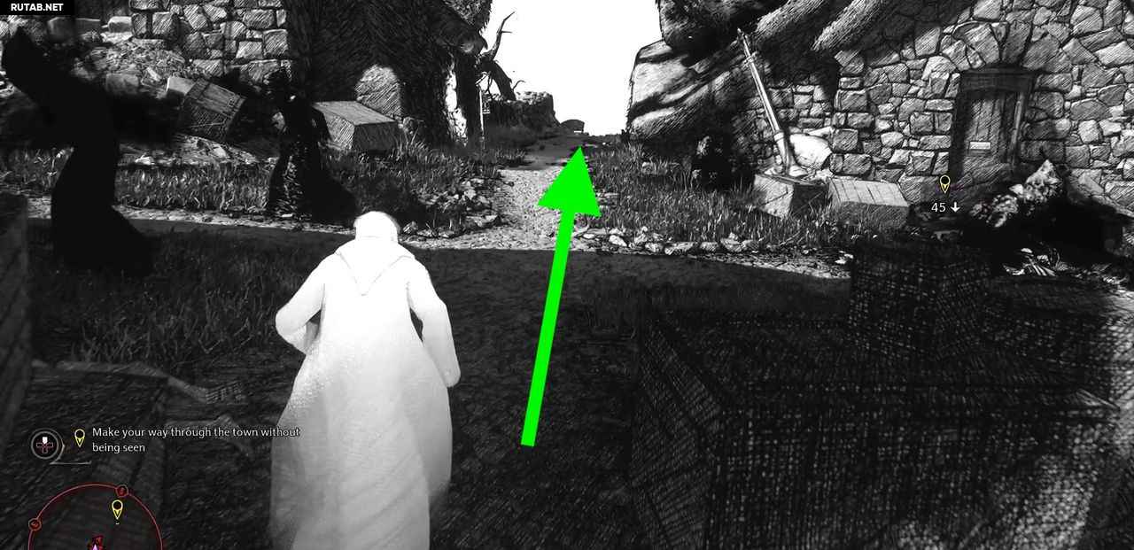 Продолжайте идти по городу, пока не увидите еще трех фигур в плащах. Тот, что справа, не будет двигаться, а два слева будут. Двигайтесь, когда второй из двух движется вверх по холму.