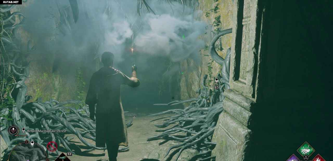 Следуйте по указанному пути внутри гробницы, через некоторое время вам нужно будет пройти Дьявольские силки. Используйте Люмос, чтобы пройти через него.