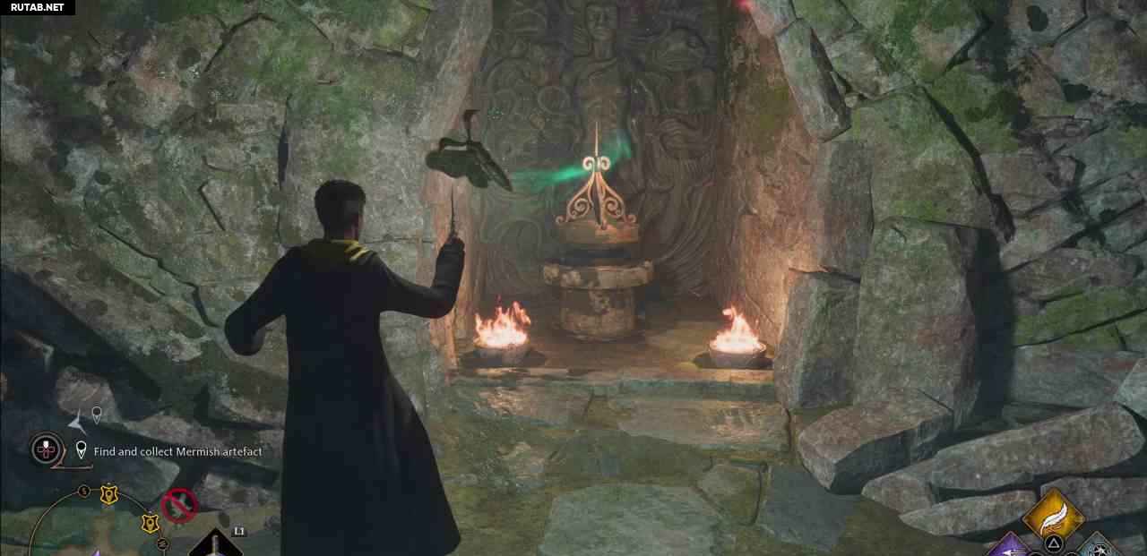Внутри пещеры вы увидите дверь, чтобы ее открыть нужно привести к ней всех трех бабочек. Для двух из трех бабочек примените Инсендио, чтобы освободить их от паутины, затем примените Люмос и отведите их к двери, еще раз примените Люмос, и они войдут в дверь.