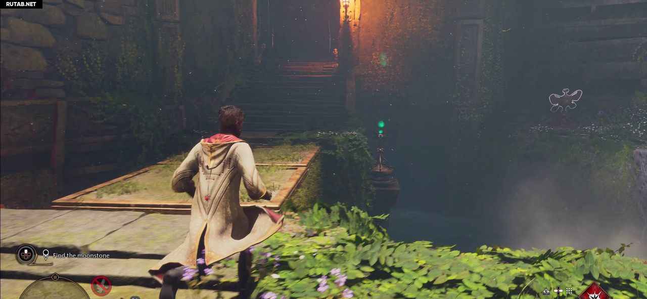 Получите первую бабочку с Люмосом. Пройдите через ворота, поверните налево и поместите мотылька на пьедестал. Затем бросьте на него Депульсо, чтобы поднять мост.