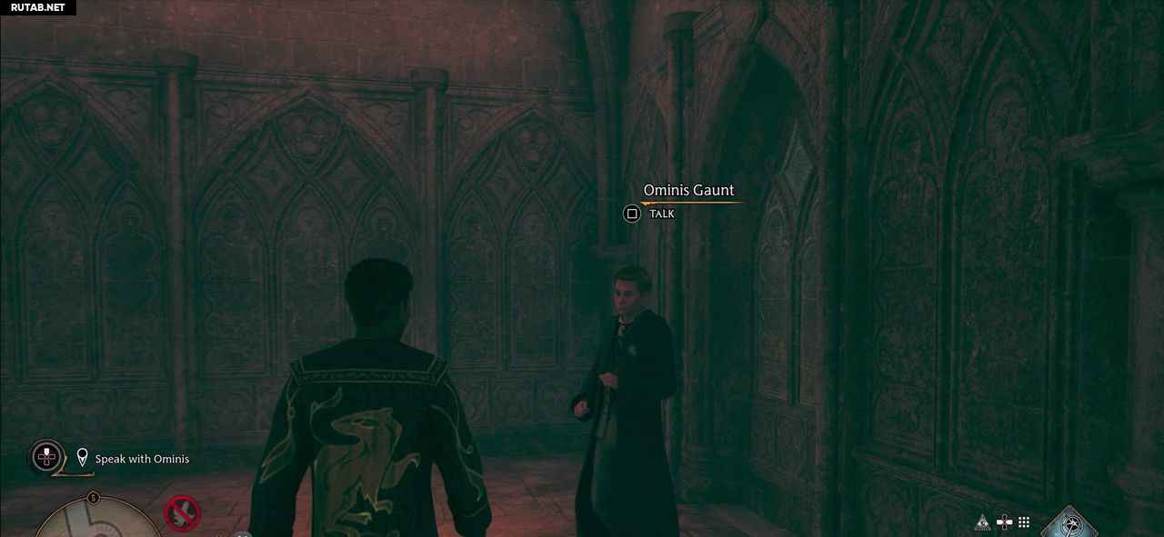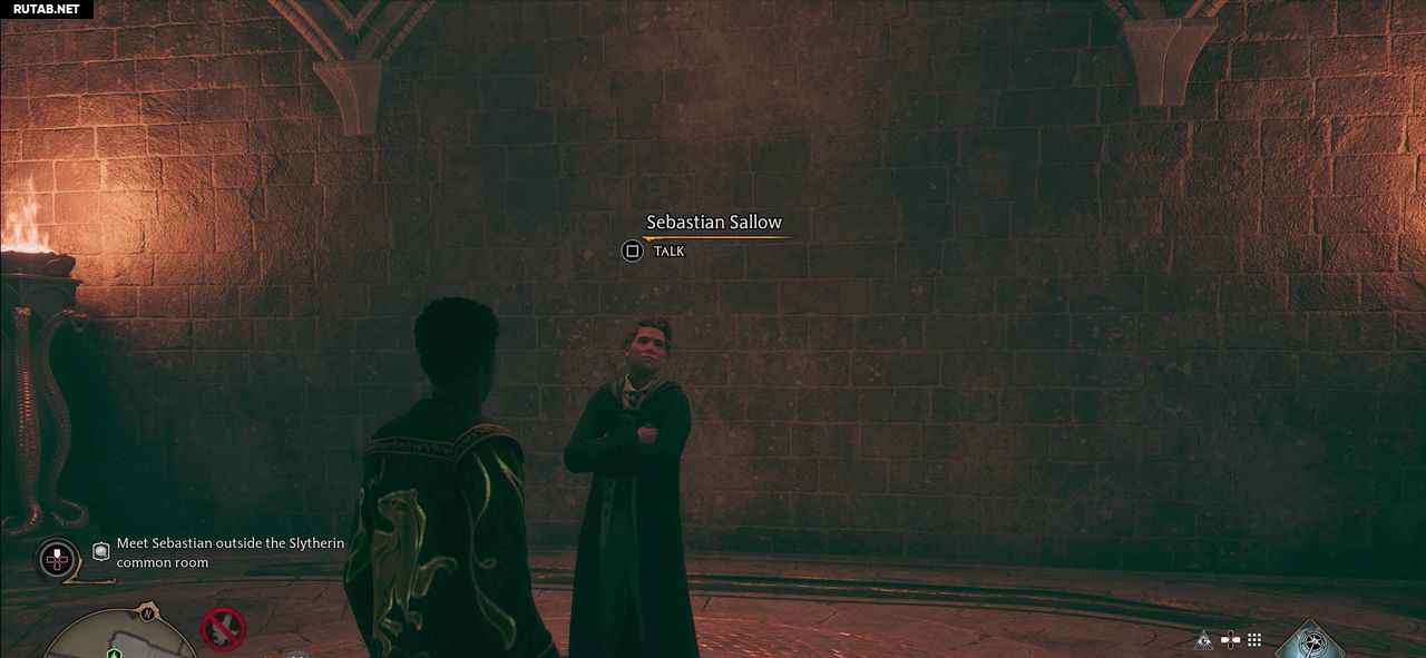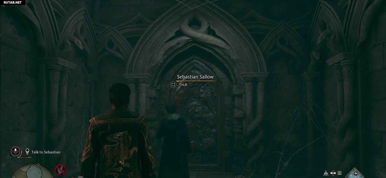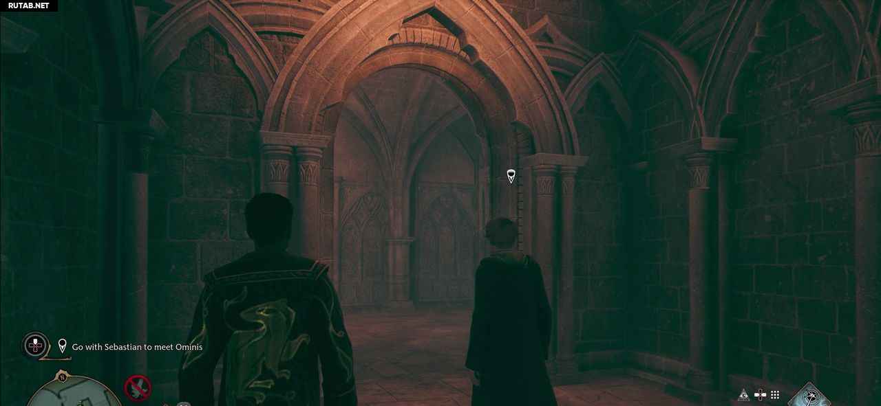 Поговорите с Себастьяном возле гостиной Слизерина. Затем следуйте за Себастьяном, чтобы встретить Оминиса.