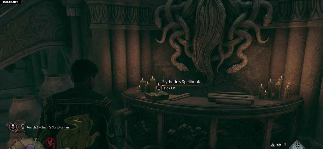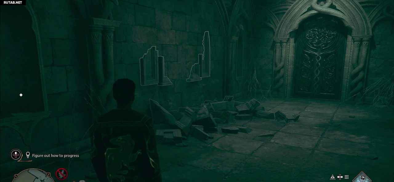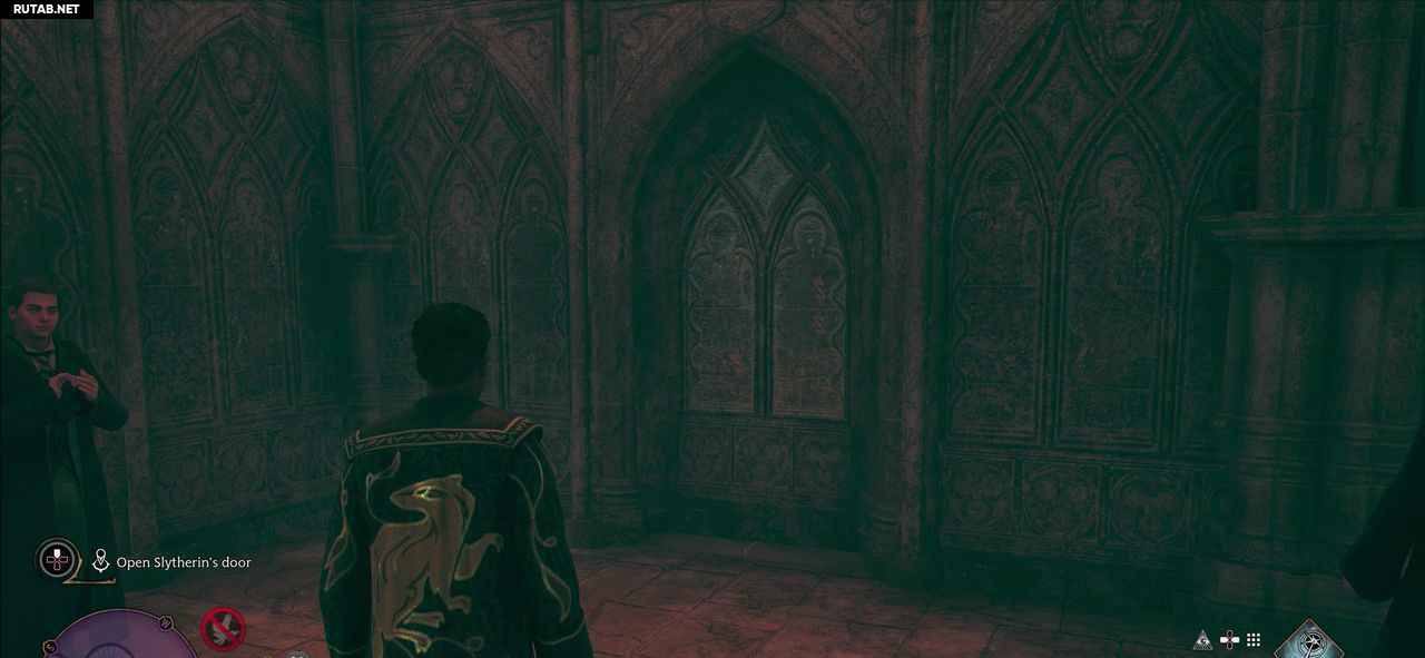 Теперь пролезайте в полуоткрытую дверь и взаимодействуйте с замком Слизерин, левым и правым стиками можно выбирать символы. Теперь сопоставьте символы с символами на запертой двери.