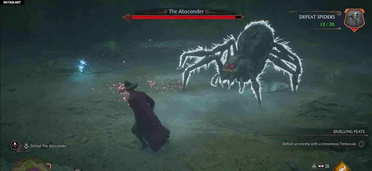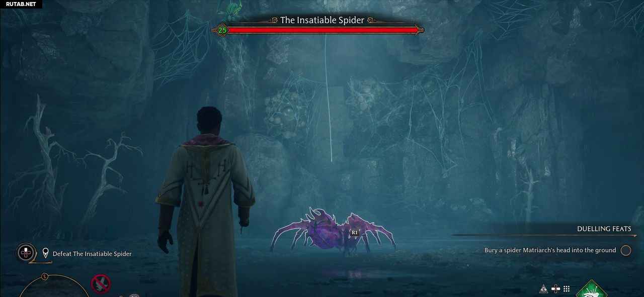 Босс во время побочного квеста: Запутанная паутина. Основная цель этого побочного квеста — победить его. Ниже на изображениях №1-2 показано начало квеста в Хогсмиде, на изображении №3 показан печально известный враг. В рамках квеста вы должны отправиться в Араншир в Южном Хогвартсе, чтобы победить этого врага-паука. Он засчитывается в счетчик коллекционирования Южного Хогвартса.