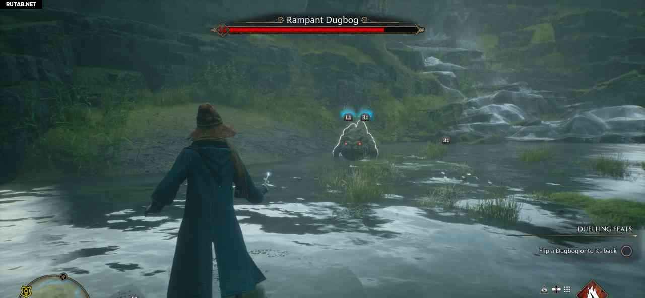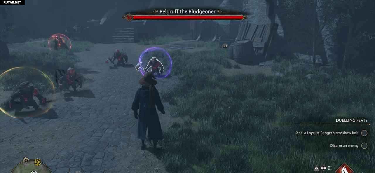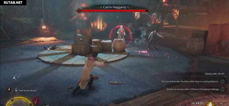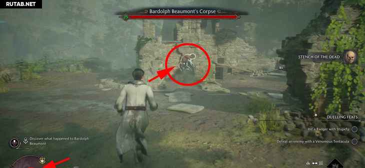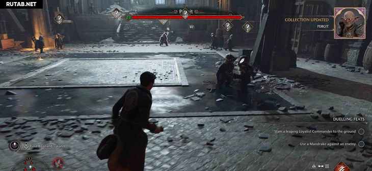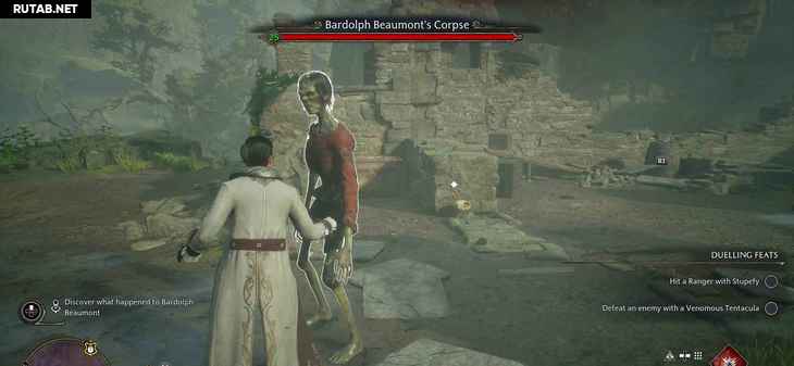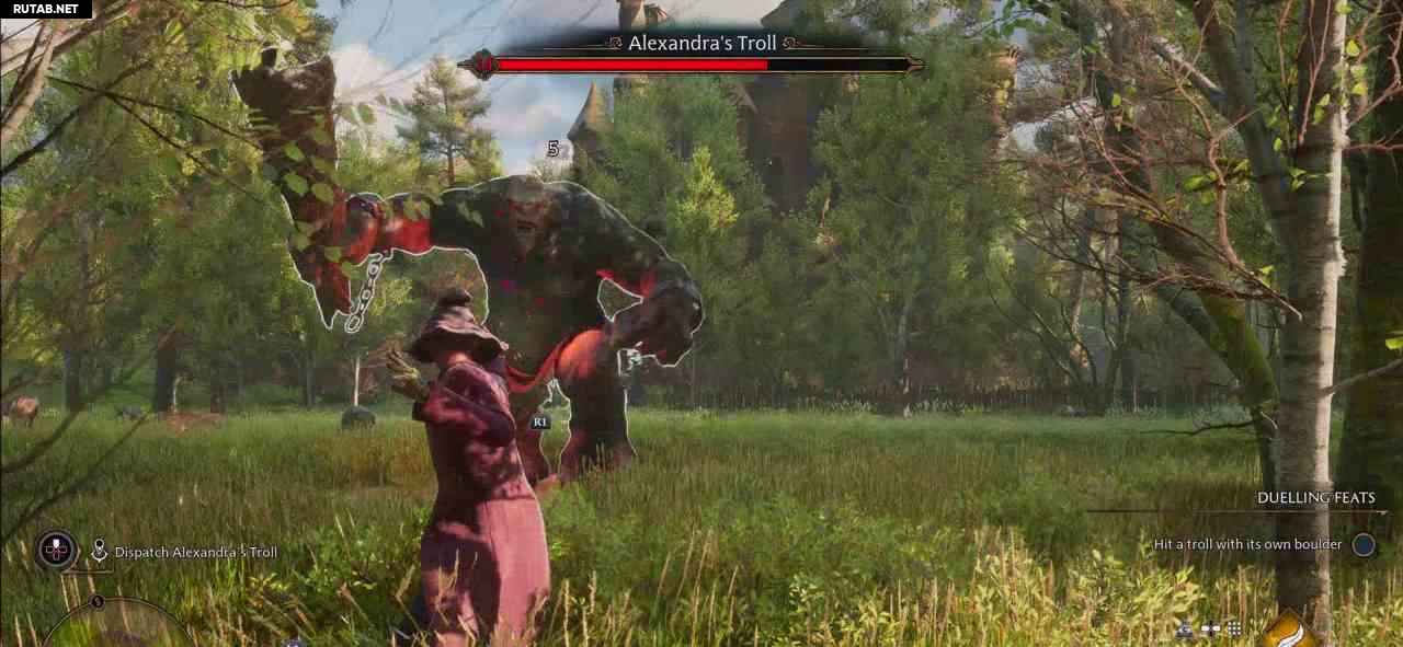 Босс Пергит во время побочного квеста: Сказка о Роуланде Дубсе, в районе Северный Хогвартс > Руины Корроу. Квест начинается в Хогвартсе -> Астрономическое крыло -> Двор трансфигурации (доступен после основного квеста: Шлем Урткота).