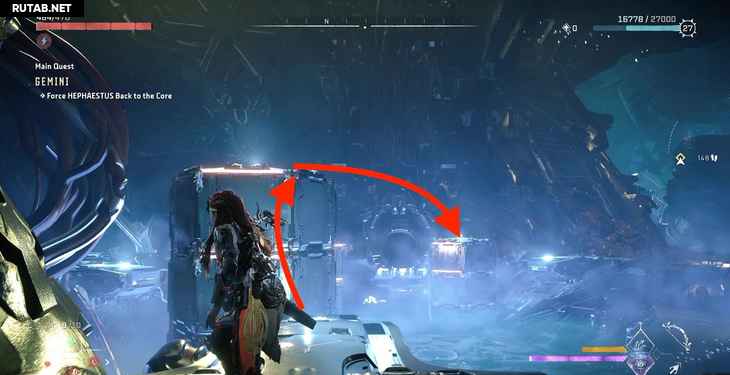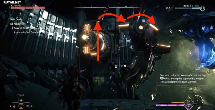 Гефест сбежал из этой области и направился во вторую, ближайшую. Выйдите через гигантскую дверь, через которую прошли машины, и используйте колонны, чтобы добраться до противоположного конца, так как весь уровень был наэлектризован Гефестом. Следуйте инструкциям на скриншотах ниже для справки.