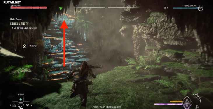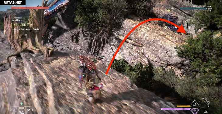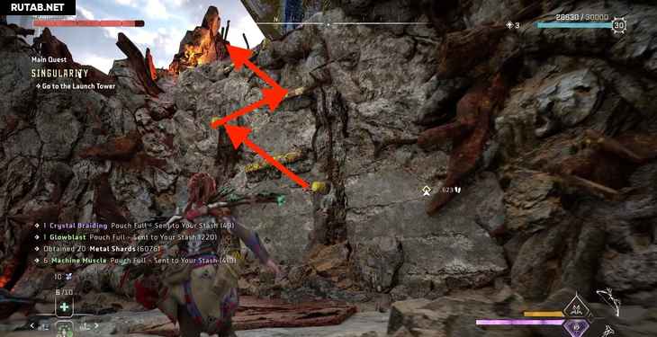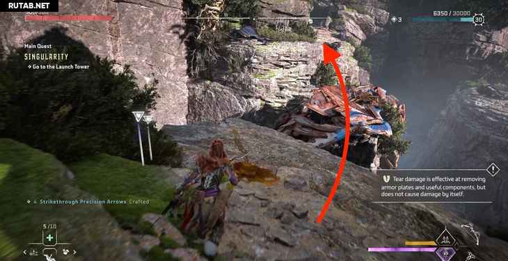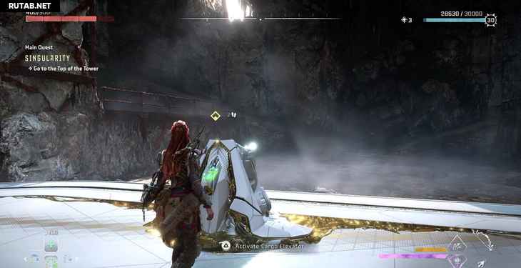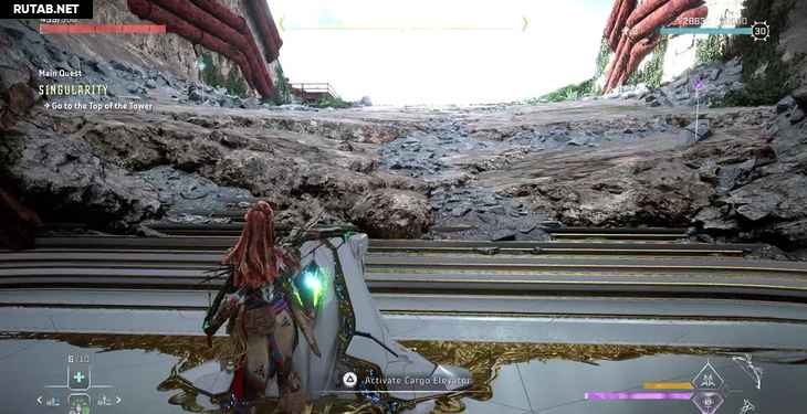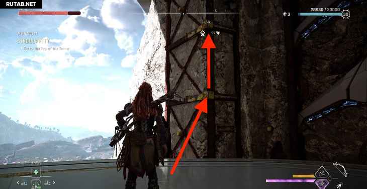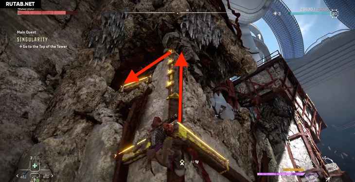 Однако пока мы поднимаемся, Жерарду удается заблокировать лифт. К счастью, Элой опытный альпинист. Активируйте свой визор, чтобы выделить несколько желтых точек подъема на одной из рам лифта, и начните подниматься.
