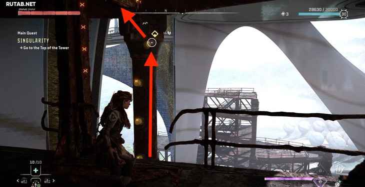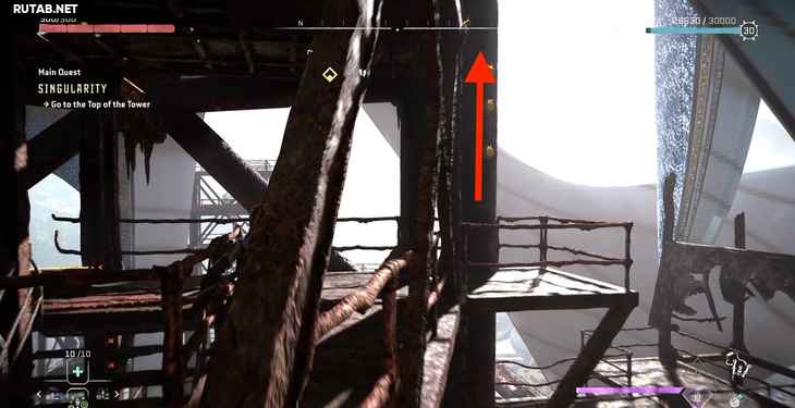 Продолжайте подниматься, пока не доберетесь до другой ржавой области с лестницей. Идите к различным лестницам и не забудьте активировать визор, чтобы узнать, куда вам нужно идти.