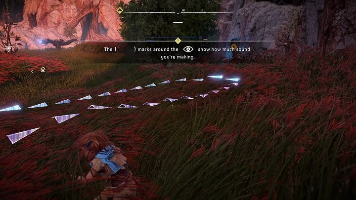 Затем следуйте за своим учителем в район с рыскарями. Время для небольшой засады. Ваша задача - бросить камень, чтобы побудить одного из рыскарей приблизиться к Расту, который прячется в близлежащих кустах. Удерживайте кнопку броска - появится линия траектории, которая поможет вам прицелиться. Используйте аналоговые стики геймпада, чтобы нацелить снаряд так, чтобы камень упал как можно ближе к Расту.