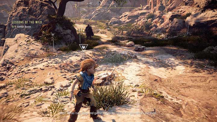 Вы достигнете высушенного русла реки. Время собирать боеприпасы - вам нужно собрать три камня, которые можно найти в непосредственной близости. Такие предметы можно найти через белые маркеры, как на скриншоте выше.