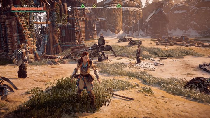 Поселение будет атаковано Захватчиком – очень проворной машиной с большим количеством прочности. Этот бой может быть тяжелым. Слабое место Захватчика - его голова. Держите его в поле зрения и сосредоточьтесь на прицеливании. Остальные члены племени помогут вам, но они не смогут за вас уничтожить Захватчика.