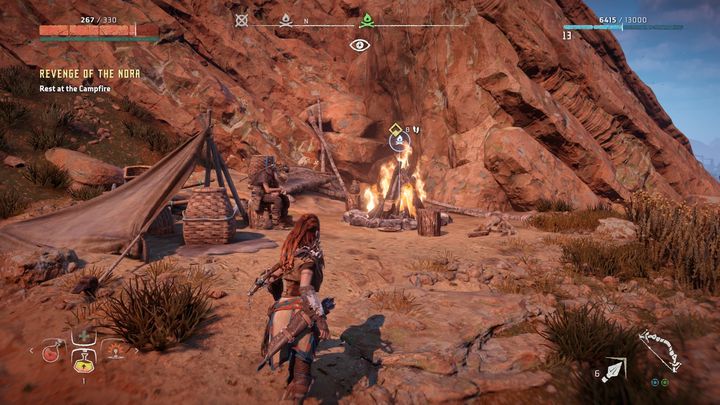 Двигайтесь к месту, указанному маркером. Если вы хотите попасть туда с запада, вы должны знать, что это место окружено, и, чтобы попасть туда, вы должны победить двух пилозубов. Когда вы доберетесь до локации, представленной на картинке выше, используйте костер, чтобы продолжить квест.