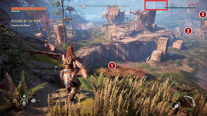 Если поблизости никого нет, можете медленно пробраться к яме, отмеченной на изображении [2]. Можете добраться до другого куста, а оттуда можете заманить других врагов. Кроме того, можете сразу же спрятаться в кустах, которые находятся дальше [3], и оттуда у вас есть возможность сделать выстрел в бочки, отмеченные на изображении. Не забудьте использовать огненные стрелы.
