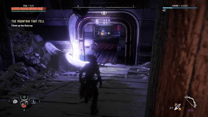 Ваша задача - добраться до другой части объекта. Используйте выступы на стене (на скриншоте выше), чтобы сделать это. Двигайтесь к поврежденной лестнице и используйте их, чтобы подняться. Следуйте указателю, чтобы активировать еще одну голограмму (сразу после кат-сцены).