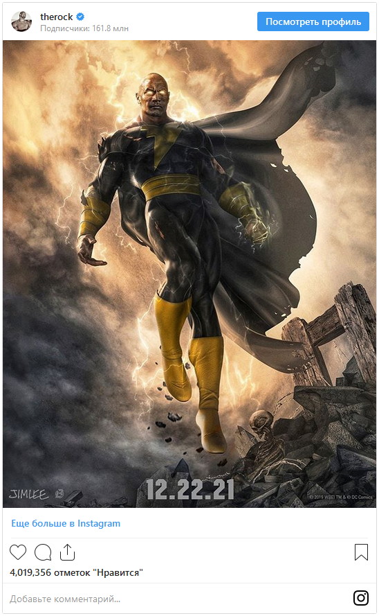Однако могучего злодея не вычеркнули из киновселенной. Ему выделили собственный фильм. И теперь исполнитель главной роли (Дуэйн «Скала» Джонсон) назвал дату премьеры. Фильм «Чёрный Адам» выйдет 22 декабря 2021 года.