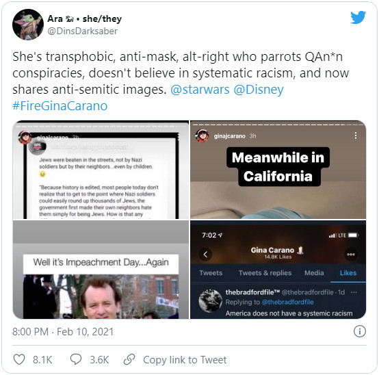 Тем временем хэштег #FireGinaCarano (уволить Джину Карано) начинает набирать популярность в социальных сетях. Его использовали создатель «Мандалорца» Джон Фавро, Disney, Disney Plus, Star Wars и Lucasfilm.