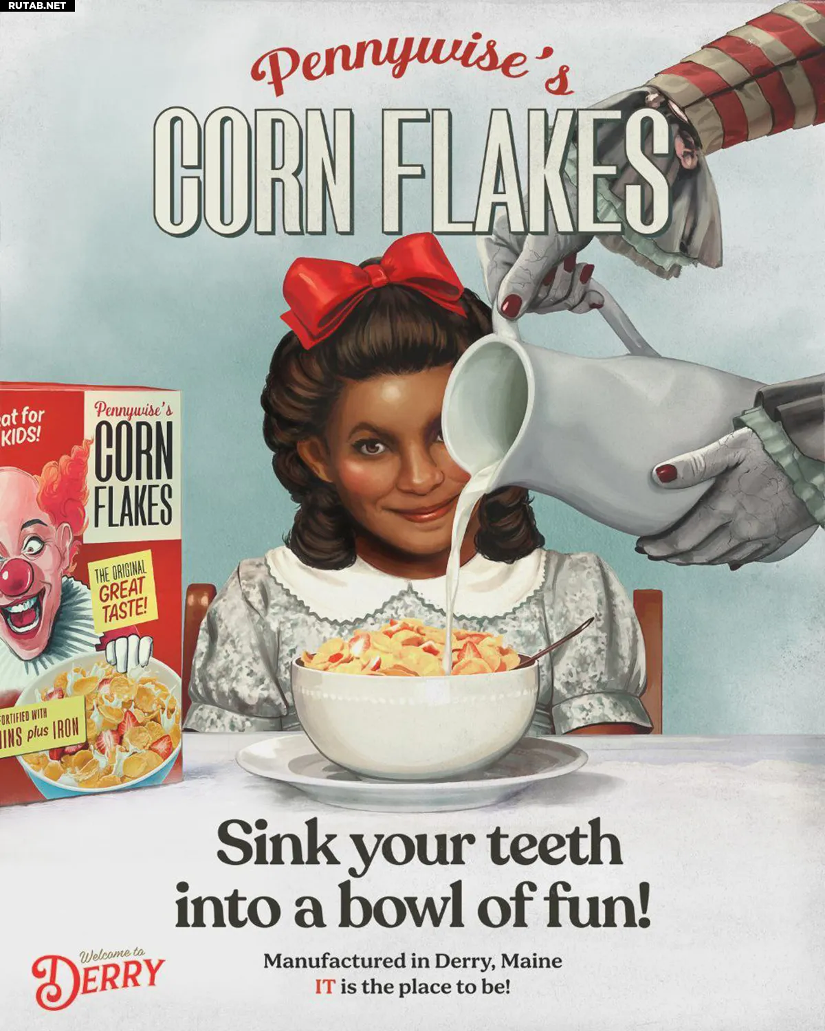 На этот раз креативные плакаты посвящены двум вымышленным продуктам: хлопьям Pennywise и маринованным огурчикам Siegel. Однако при внимательном рассмотрении становятся заметны жуткие детали: демонический клоун Пеннивайз лично наливает молоко в хлопья собственного бренда, а среди маринованных огурчиков можно разглядеть отрезанный человеческий палец.