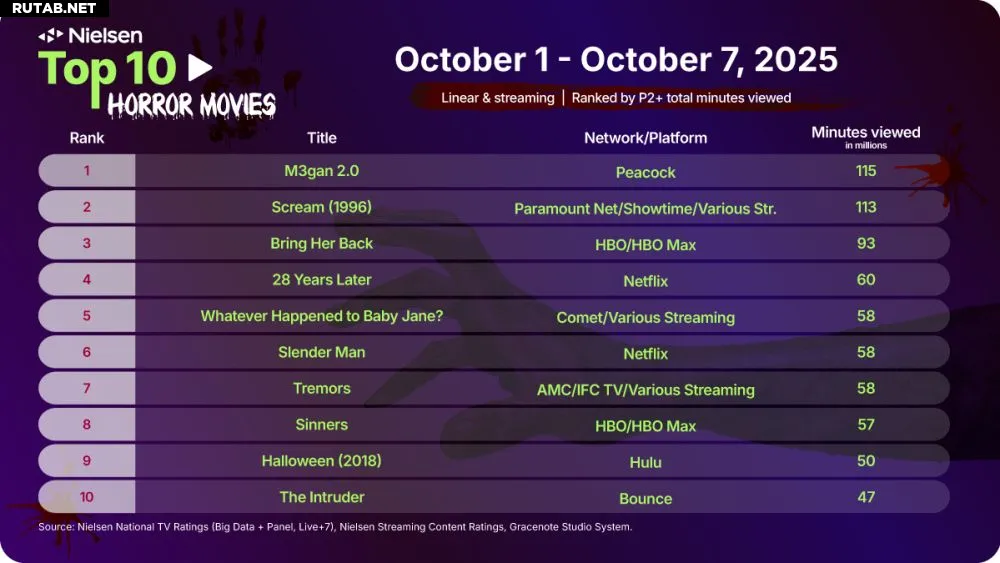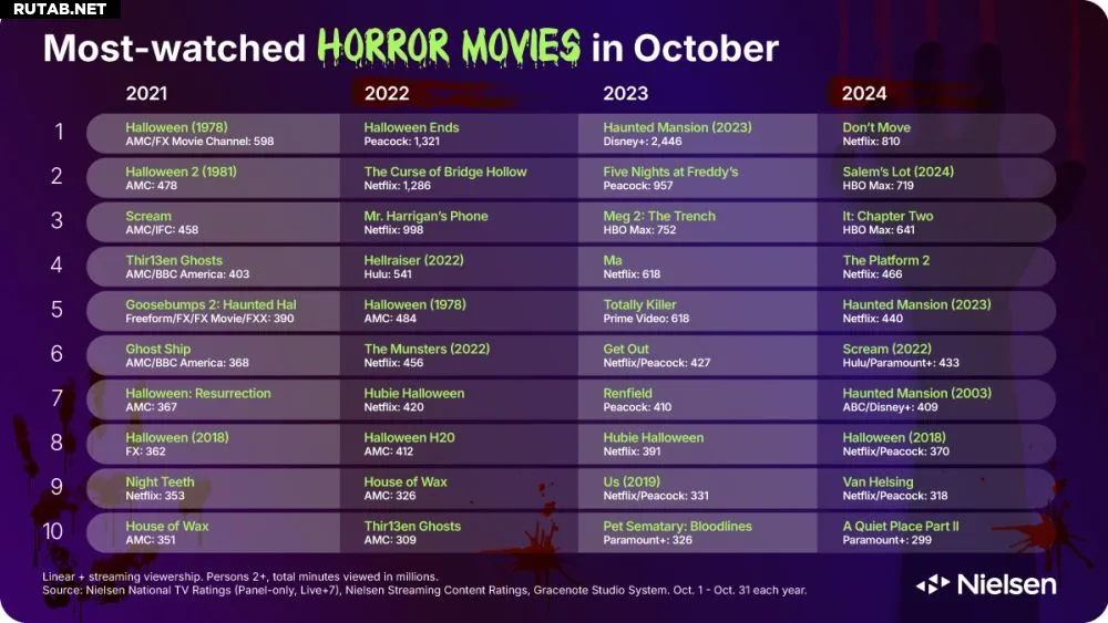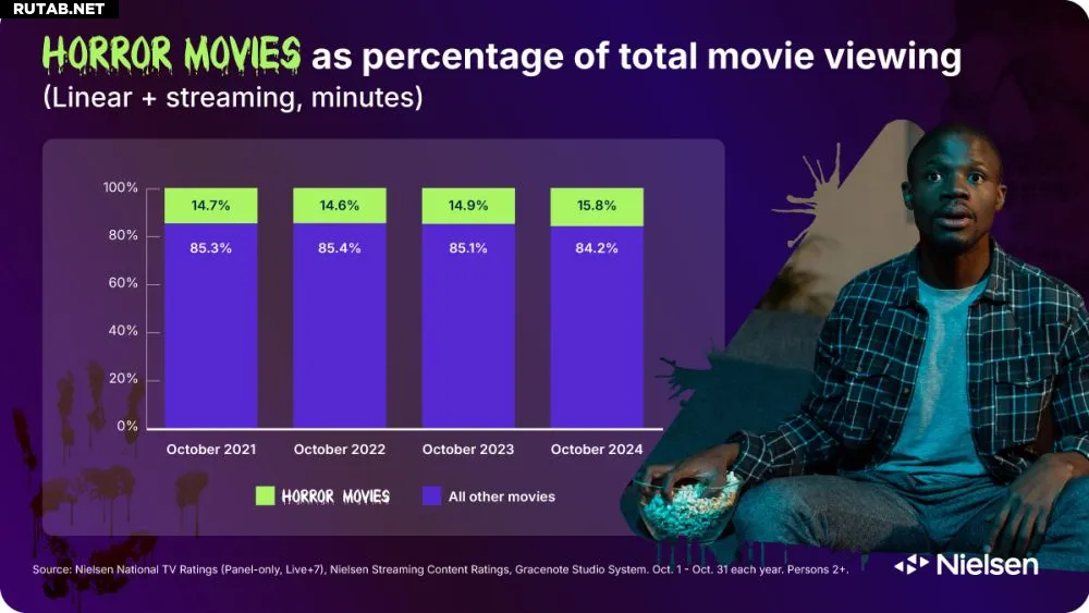 Отчет Nielsen о Хэллоуине выделяет неожиданную тенденцию. Даже с растущим изобилием доступного контента фильмы ужасов выделяются как объединяющая сила, привлекающая аудиторию из разных демографических групп более равномерно, чем другие жанры, поскольку пользователи постоянно пересматривают классику и открывают для себя новые релизы.