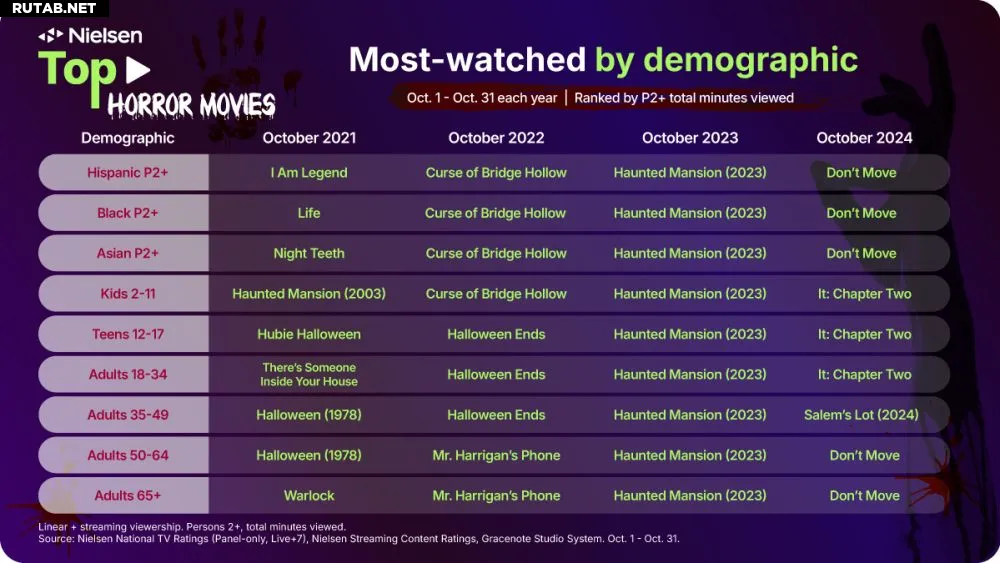 Nielsen также проанализировала аудиторию фильмов ужасов с октября 2021 по 2024 год по демографическим группам, изучив тенденции среди разных рас и возрастных групп, и проанализировала фильмы ужасов в процентах от общего количества просмотров кино.