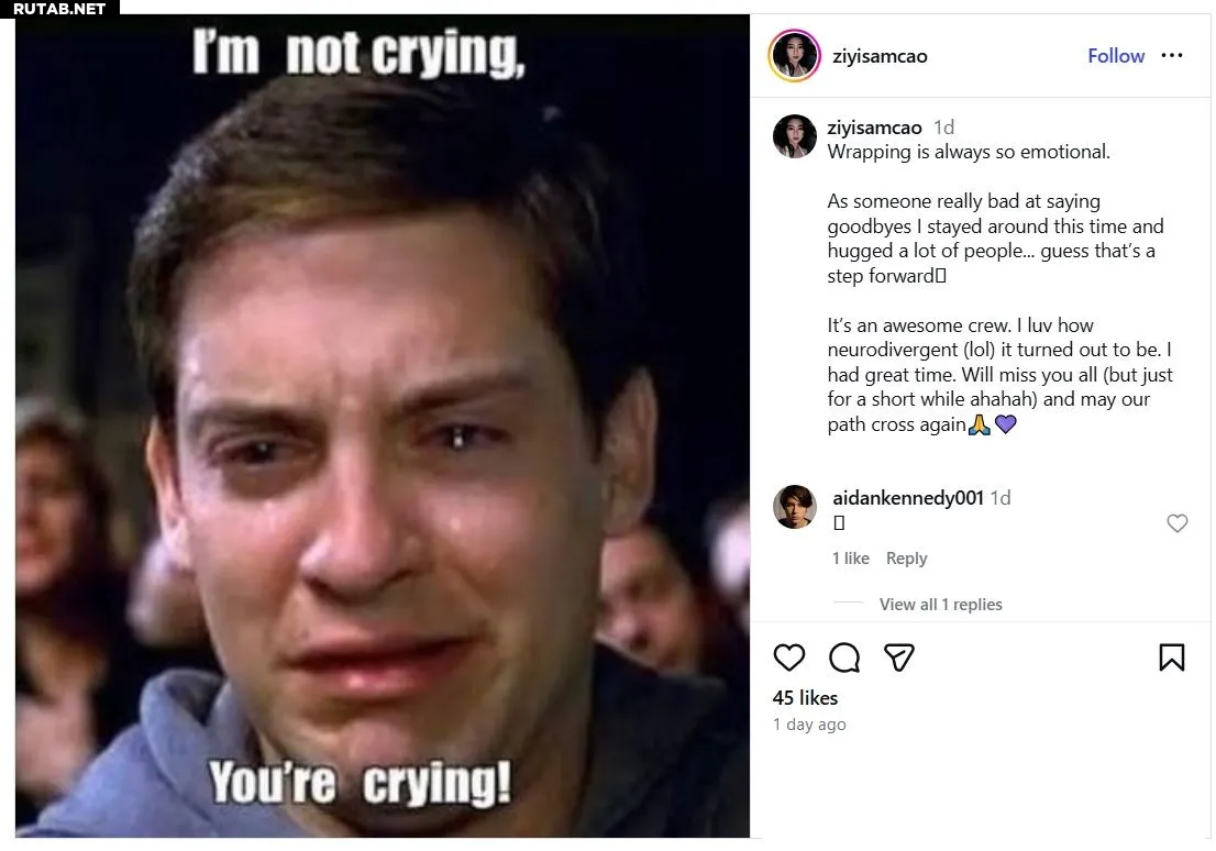 Цао написала: «Завершение съёмок всегда так эмоционально. Как человек, который очень плохо прощается, на этот раз я осталась и обняла много людей... думаю, это шаг вперёд». Она также добавила: «Это потрясающая команда. Мне нравится, насколько нейроразнообразной (лол) она оказалась. Я прекрасно провела время. Буду скучать по вам всем (но ненадолго, хахаха), и пусть наши пути снова пересекутся🙏💜».