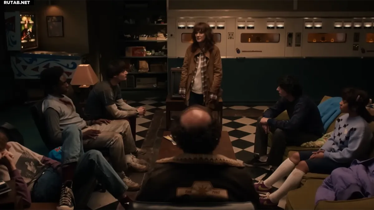 Отрывок, который начинается с 10:11 минуты записи шоу, показывает сцену совещания ключевых героев. Джойс Байерс собирает их всех за столом, чтобы обсудить план по уничтожению главного антагониста — Векны.