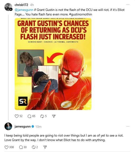 Сооснователь DC Studios Джеймс Ганн отреагировал на распространившиеся в сети слухи о возможном возвращении актёра Гранта Гастина в роли Флэша в рамках новой вселенной DC (DCU).