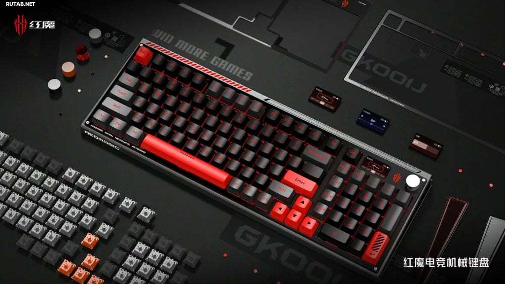 Кроме того, клавиатура имеет небольшой 1,47-дюймовый экран в правом верхнем углу, который может отображать параметры в реальном времени и настраиваемые обои Red Magic. Ручка рядом с экраном позволяет быстро регулировать громкость и другие параметры системы.