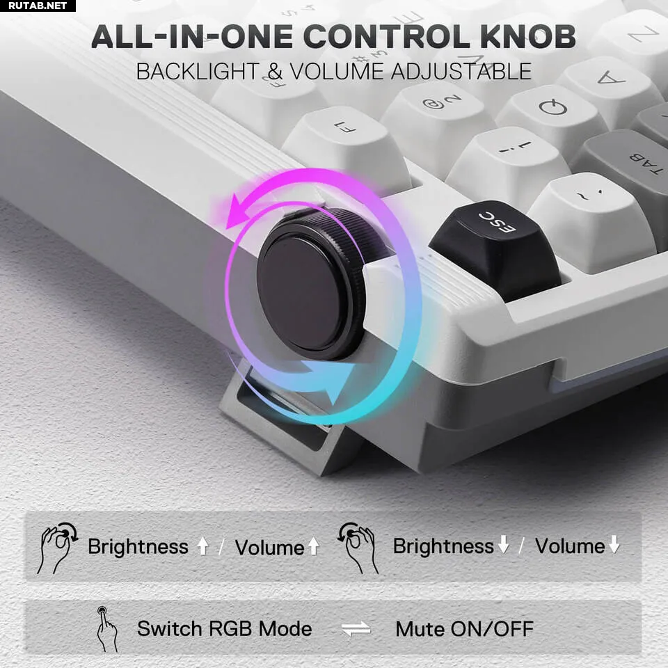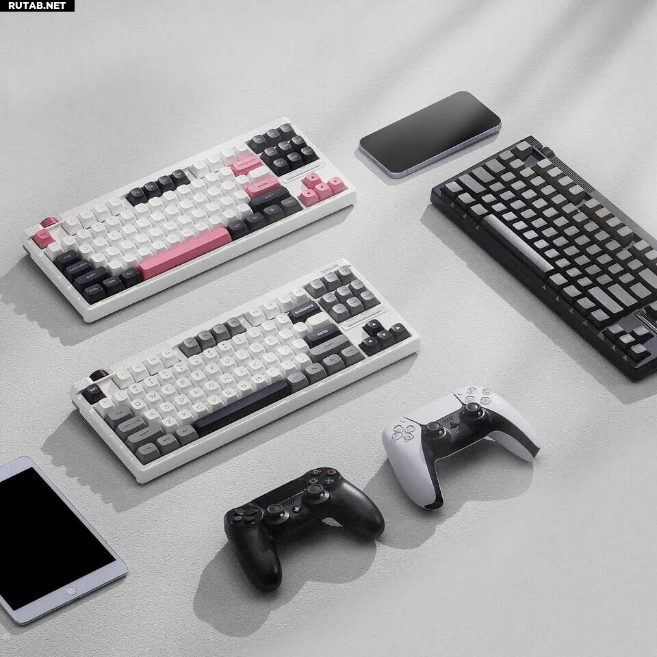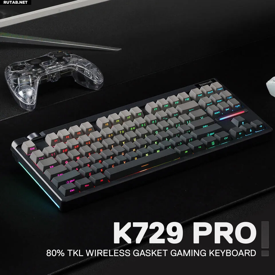 Otiim K729 Pro — это беспроводная механическая клавиатура с классической TKL-раскладкой, пластиковым корпусом, заполненным шумопоглощающими материалами, и поворотным энкодером, который расположен нестандартно — горизонтально вдоль верхнего края корпуса. Модель доступна в бело-сером цветовом варианте со скруглёнными двухкомпонентными PBT-клавишами, похожими на OEM, или в версии «Black Gradient» с двухкомпонентными PBT-клавишами OEM-профиля и боковой легендой. Корпус также оснащён двухступенчатыми откидными ножками, хотя Redragon не предоставила точных углов наклона для набора текста.