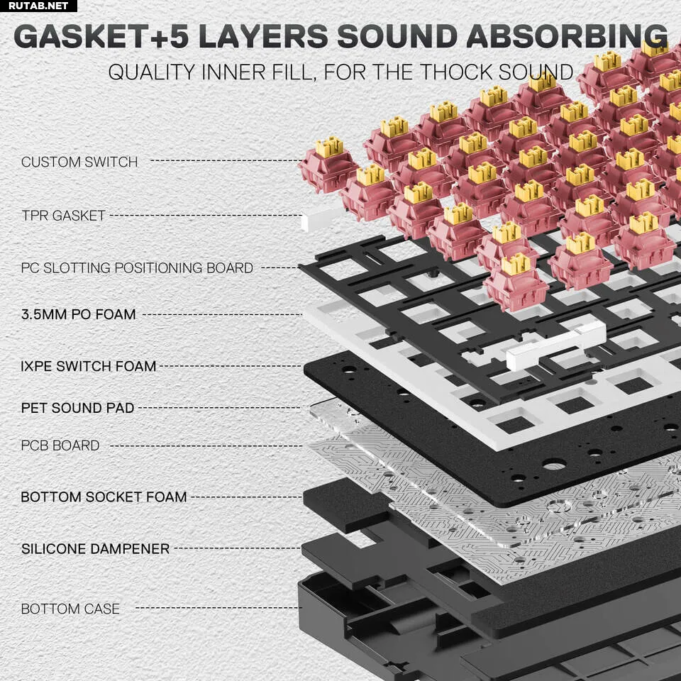 Redragon Otiim K729 Pro также стала первой механической клавиатурой бренда, в которой используются собственные бесшумные переключатели. Речь идёт о переключателях Silent Peach, которые, судя по цвету и конструкции, являются версией Outemu Silent Peach V3. Эти линейные переключатели имеют коробообразный стержень, общий ход 3,3 мм и усилие срабатывания 40 грамм. Дистанция срабатывания составляет стандартные 2,0 мм, но общий ход уменьшен по сравнению с обычными 4 мм в механических переключателях за счёт внутренних силиконовых демпферов, которые обеспечивают бесшумность. В сочетании с гаскетным креплением клавиатуры эти бесшумные переключатели должны обеспечить довольно мягкий и практически бесшумный опыт печати, что, по словам Redragon, важно для офисных пользователей. Если переключатели не понравятся, их можно заменить, так как Otiim K729 Pro совместима с обычными 3- и 5-пиновыми механическими переключателями.
