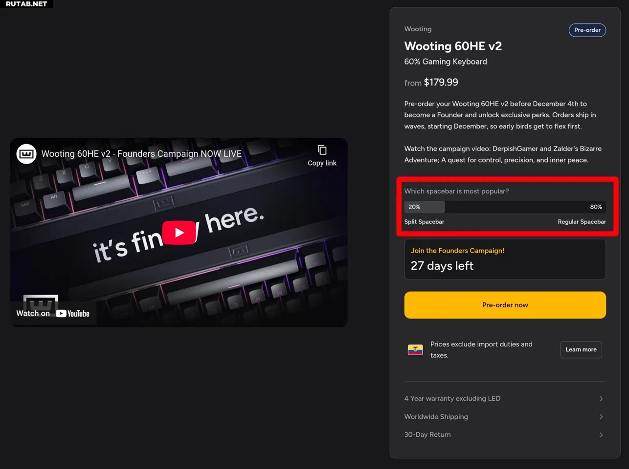 Одним из самых заметных изменений в 60HE v2 стала опциональная раскладка с разделённым пробелом. Wooting разместила на странице предзаказов счётчик, показывающий долю заказов с разделённым и традиционным пробелом. На момент написания заметки покупатели Wooting 60HE v2 решительно склоняются к традиционной раскладке: разделённый пробел выбрали лишь 20% предзаказчиков, тогда как оставшиеся 80% предпочли классический пробел. Это не стало неожиданностью, поскольку разделённый пробел обычно встречается на клавиатурах для энтузиастов и эргономичных моделях, которые составляют меньшинство и в целом отделены от рынка игровых клавиатур.