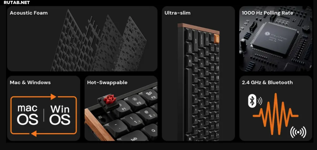 Клавиатура также оснащена акустической пеной EPDM и дополнительным демпфирующим слоем в нижней части корпуса, что улучшает звук печати и снижает шум. Переработанные стабилизаторы повышают стабильность и уменьшают люфт на крупных клавишах, таких как пробел и Enter.