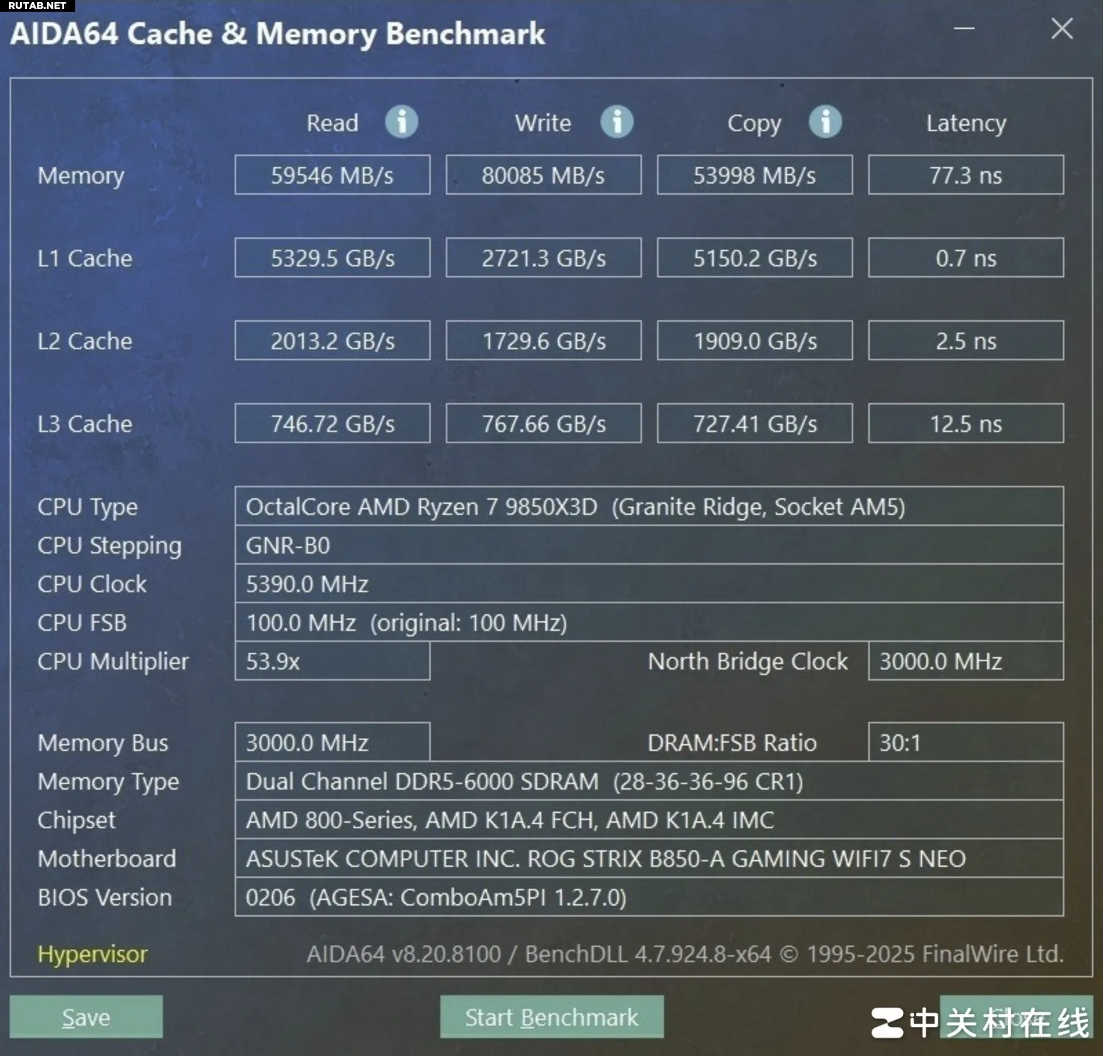 В двухканальном режиме (2x16 ГБ DDR5-6000) скорость чтения достигла 59546 МБ/с, записи — 80085 МБ/с, копирования — 53998 МБ/с, а задержка составила 77,3 нс. Теперь посмотрим на результаты одной планки.