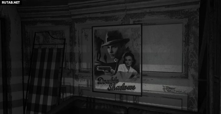 Киноплакат № 14 (черная тень на сине-черном фоне): когда вы доберетесь до места, где слышите выстрелы, поверните ручку, чтобы открыть дверь справа от вас. Постер фильма висит на стене.
