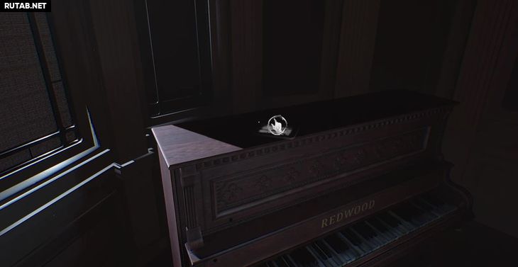 Фотослайд № 8: после падения с лестницы вы в конечном итоге окажетесь в красном зале с большим растением. С левой стороны комнаты находится пианино. На вершине пианино находится коллекционный предмет.