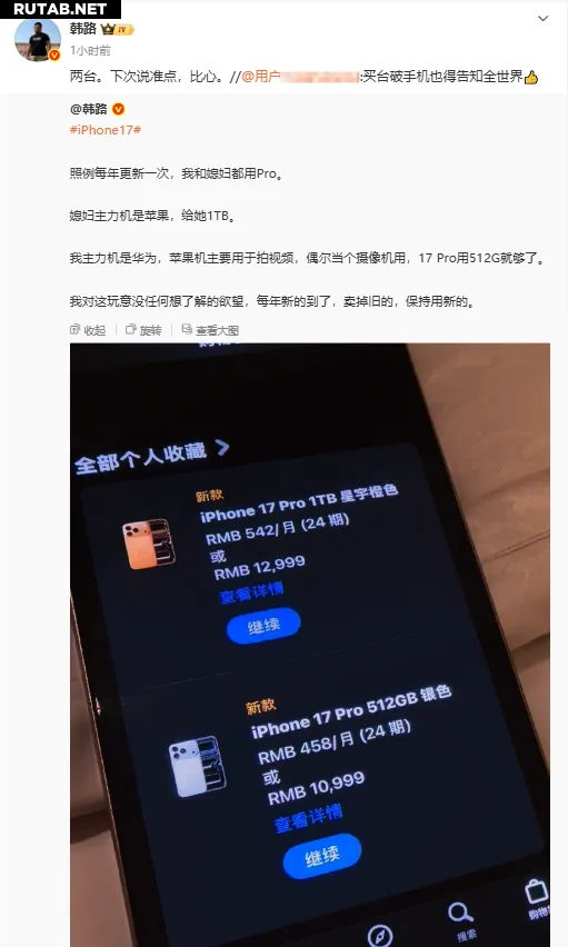 Китайский блогер Хань Лу вызвал дискуссию в сети после публикации в Weibo о покупке двух новых iPhone 17 Pro сразу после анонса Apple.