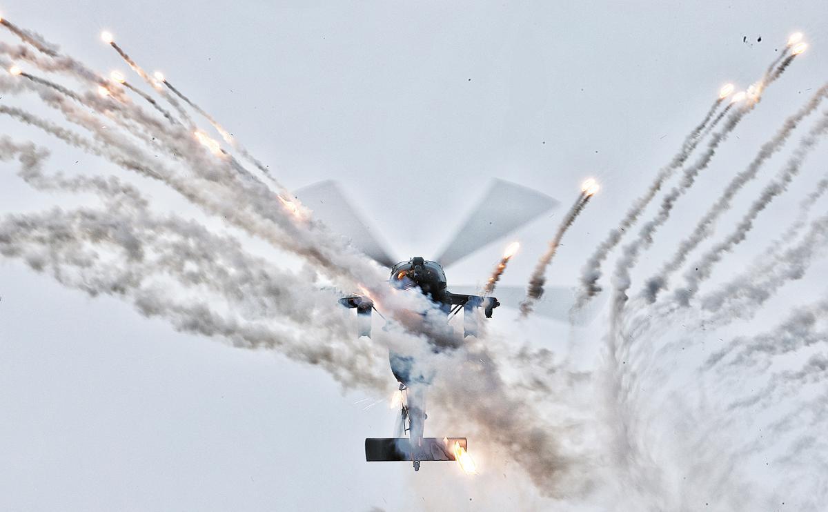Вертолет Z-20T выпускает тепловые ловушки во время демонстрационного полета на 7-й Китайской вертолетной выставке в Тяньцзине в четверг. TAO RAN/FOR CHINA DAILY