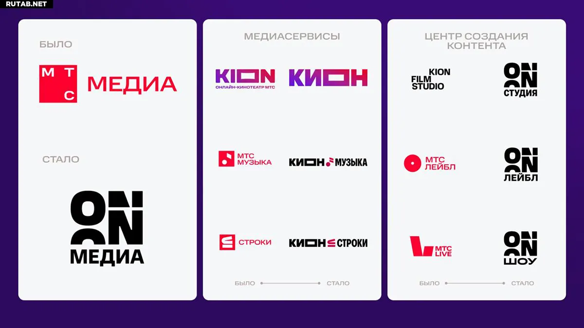 Онлайн-кинотеатр KION будет переименован в «КИОН», музыкальный сервис «МТС Музыка» станет «КИОН Музыка», а книжный сервис «Строки» превратится в «КИОН Строки». Ребрендинг также коснётся B2B-направления: продюсерский центр KIONFILM сменит название на «ON Студия», а музыкальная компания МТС Лейбл — на «ON Лейбл».