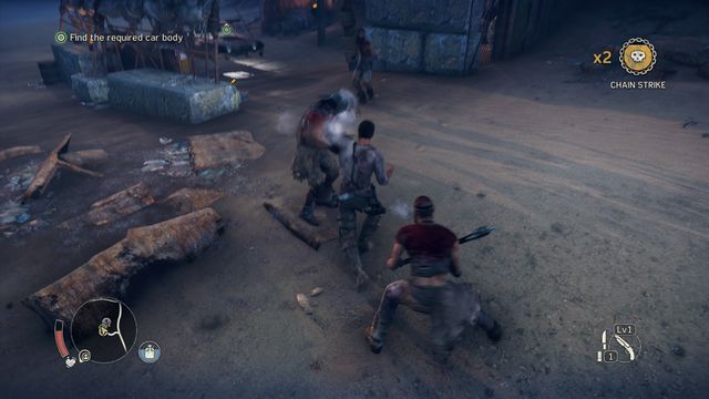 Добравшись до отмеченного места, избавьтесь от трех противников. Особенно остерегайтесь парня с большой дубинкой – наносимый им урон опасен. Если вы уничтожите его в первом порядке, то можете подобрать его оружие и легко позаботиться о других врагах. Обыщите место - вы найдете 2x лом, Металлоломщики выше и цель вашей миссии - Кузов автомобиля - висит выше.