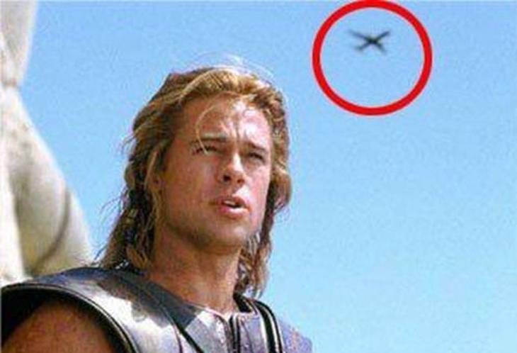 #7. "Троя" (2004). Фильм полон ошибок. В одной из сцен у Парис и Елены над головами находится зонтик с металлическими спицами, а в другой при увеличении в небе заметен целый самолет. В фильме монеты кладутся на глаза умерших. Между тем, в мифологии упоминалось, что их подносят ко рту.