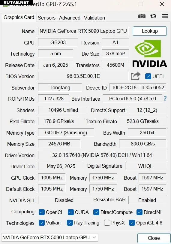 RTX 5090: 24GB GDDR7, 10496 CUDA-ядер, частота 1095-1597 МГц, 256-битная шина, 896 ГБ/с пропускная способность, TDP 175W.
